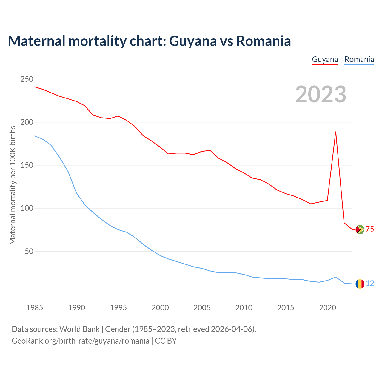 The maternal mortality rate, which is the probability of dying during childbirth or within 42 days of pregnancy termination, is 75 deaths per 100,000 live births in Guyana, compared to 12 deaths in Romania.