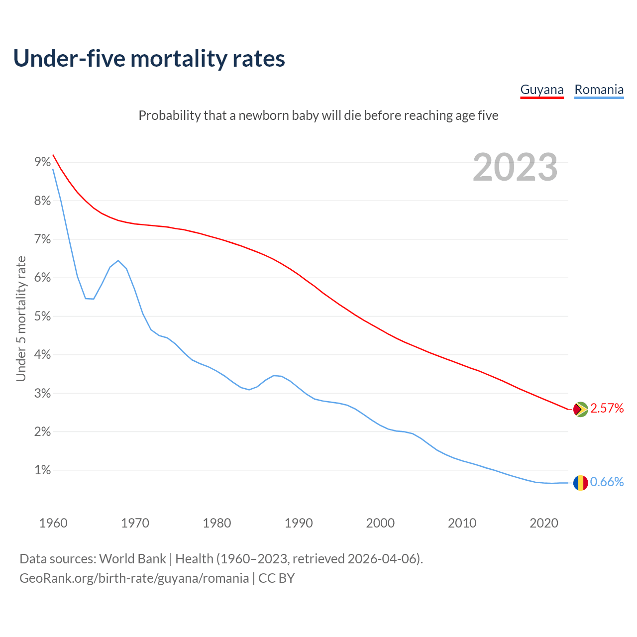 The chance that a newborn baby will die before reaching age five is 2.57% in Guyana and 0.66% in Romania. Above is a chart with historical data on under-five mortality rates.