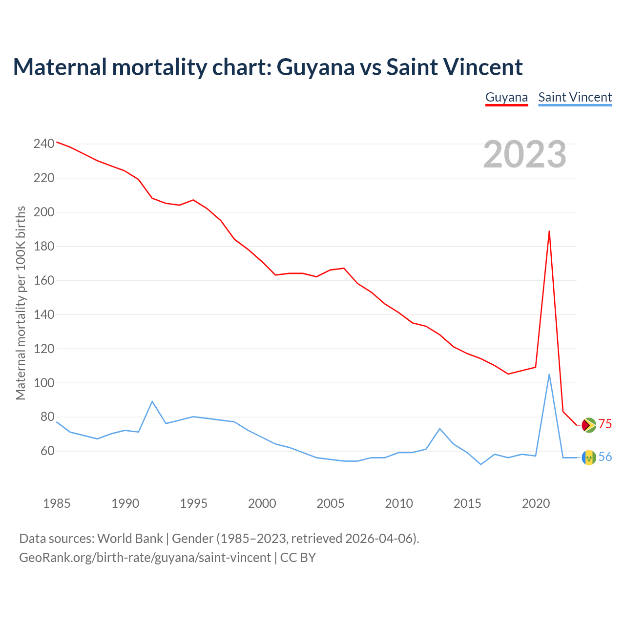 The maternal mortality rate, which is the probability of dying during childbirth or within 42 days of pregnancy termination, is 75 deaths per 100,000 live births in Guyana, compared to 56 deaths in Saint Vincent.