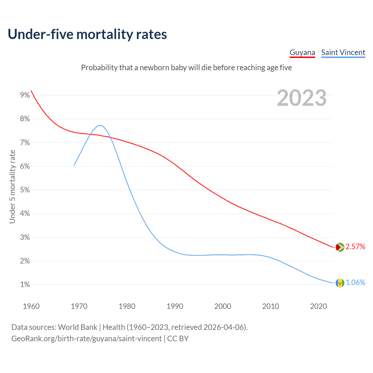 The chance that a newborn baby will die before reaching age five is 2.57% in Guyana and 1.06% in Saint Vincent. Above is a chart with historical data on under-five mortality rates.