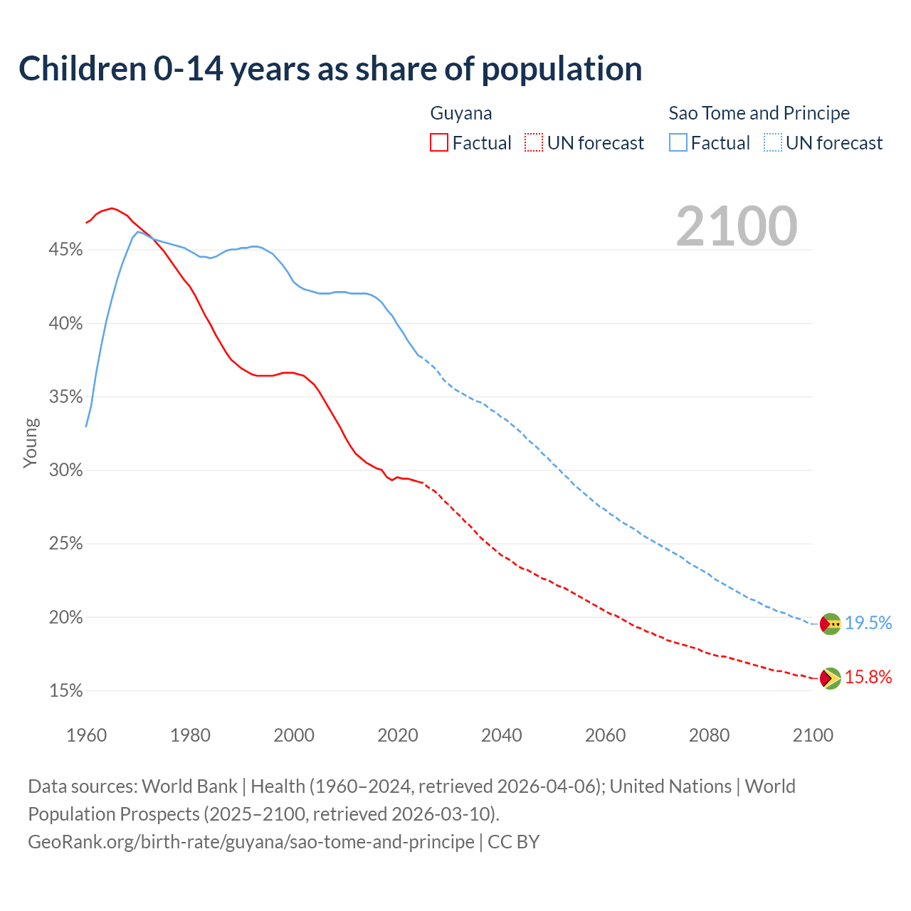 According to the latest available data on birth rates, the fertility rate in Guyana was 2.41 children per woman in 2023, compared to 3.64 in Sao Tome and Principe in 2023. The replacement level is considered to be 2.1 children per woman.