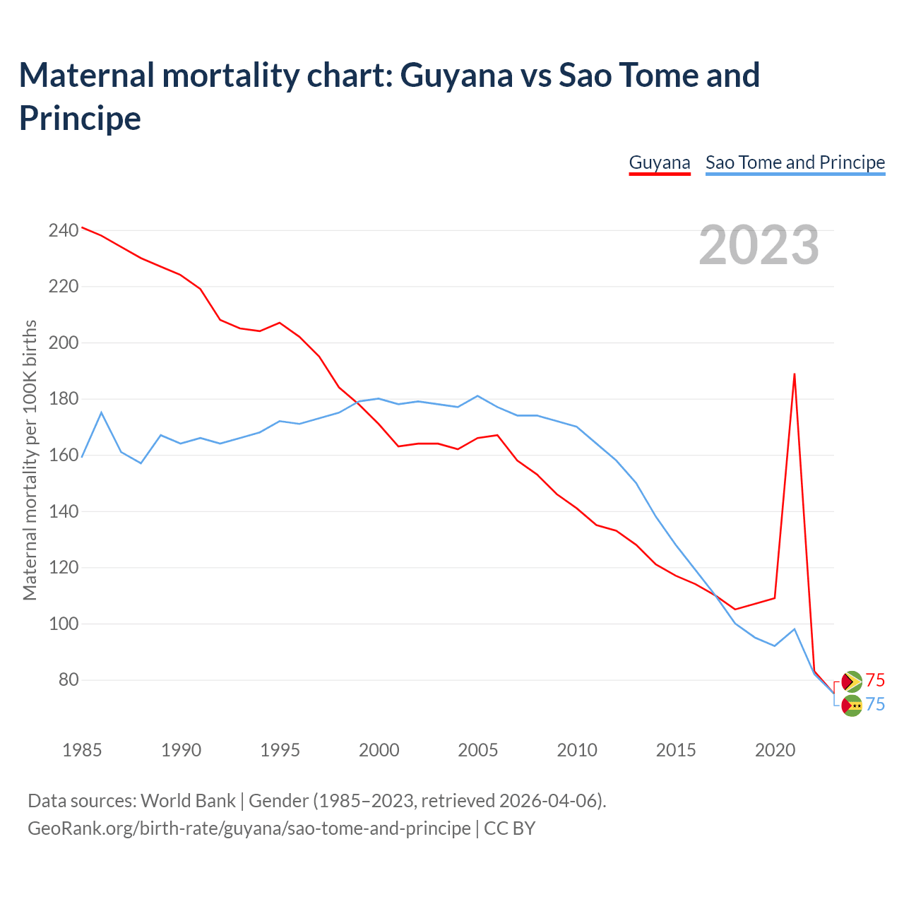 The maternal mortality rate, which is the probability of dying during childbirth or within 42 days of pregnancy termination, is 75 deaths per 100,000 live births in Guyana, compared to 75 deaths in Sao Tome and Principe.