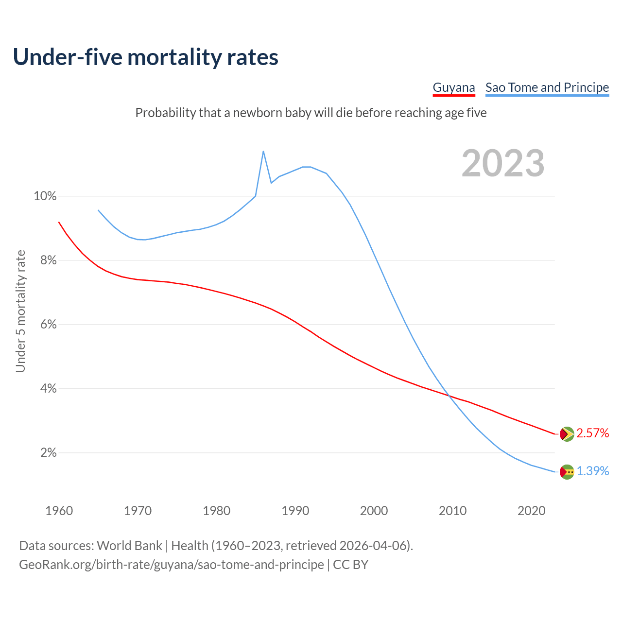 The chance that a newborn baby will die before reaching age five is 2.57% in Guyana and 1.39% in Sao Tome and Principe. Above is a chart with historical data on under-five mortality rates.