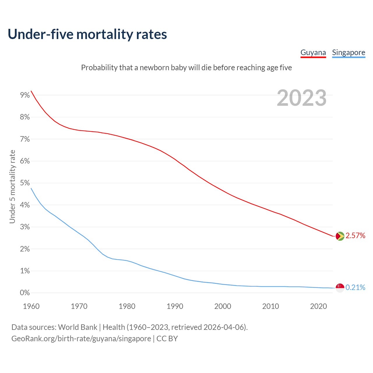 The chance that a newborn baby will die before reaching age five is 2.57% in Guyana and 0.21% in Singapore. Above is a chart with historical data on under-five mortality rates.
