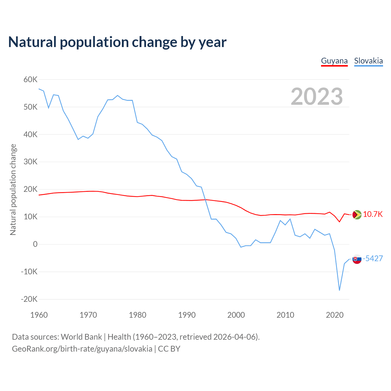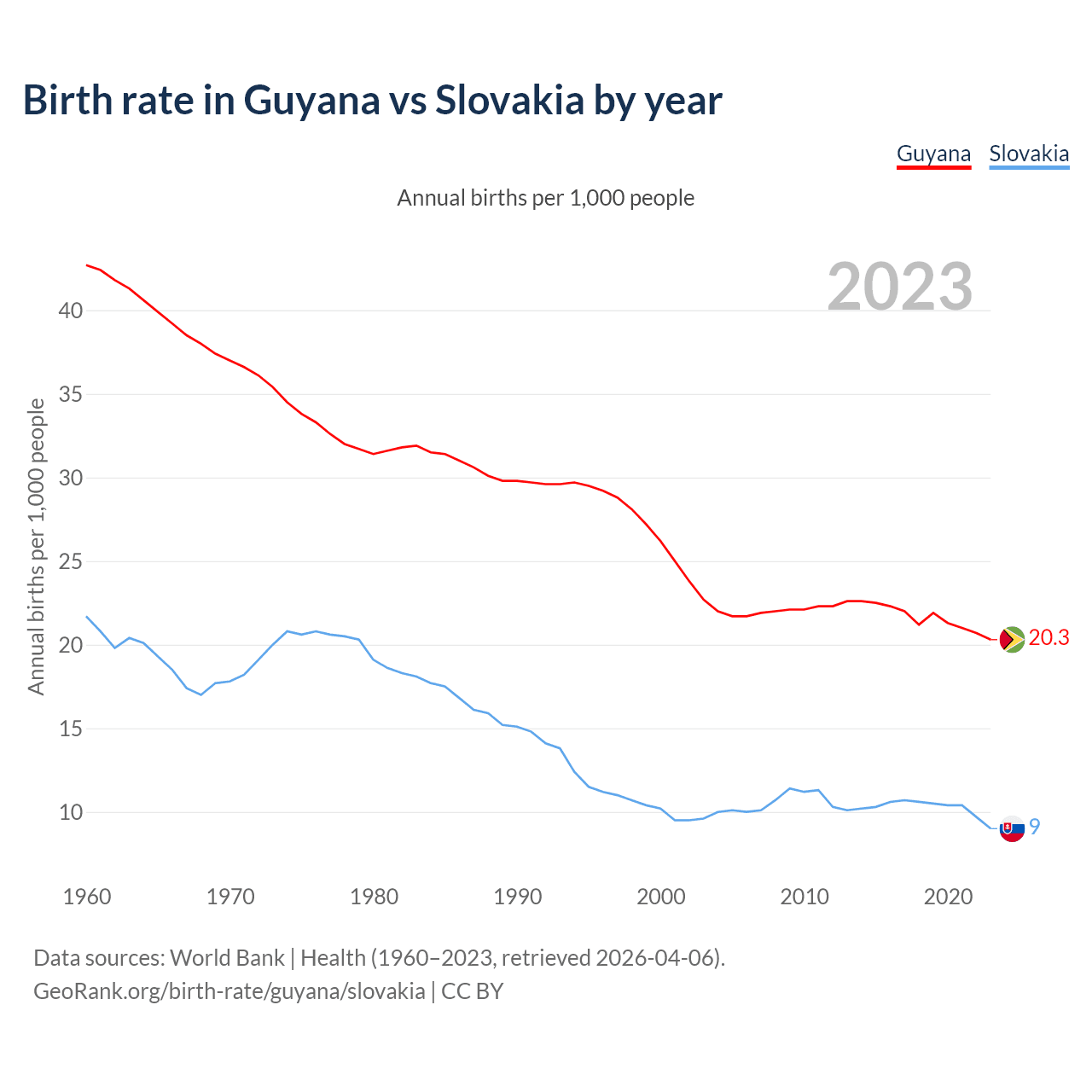 According to the latest available data on birth rates, the fertility rate in Guyana was 2.41 children per woman in 2023, compared to 1.49 in Slovakia in 2023. The replacement level is considered to be 2.1 children per woman.