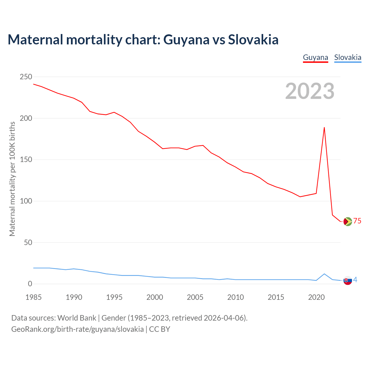The maternal mortality rate, which is the probability of dying during childbirth or within 42 days of pregnancy termination, is 75 deaths per 100,000 live births in Guyana, compared to 4 deaths in Slovakia.