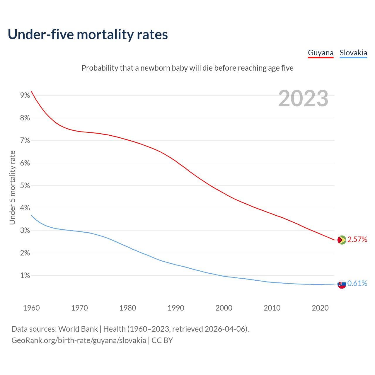 The chance that a newborn baby will die before reaching age five is 2.57% in Guyana and 0.61% in Slovakia. Above is a chart with historical data on under-five mortality rates.