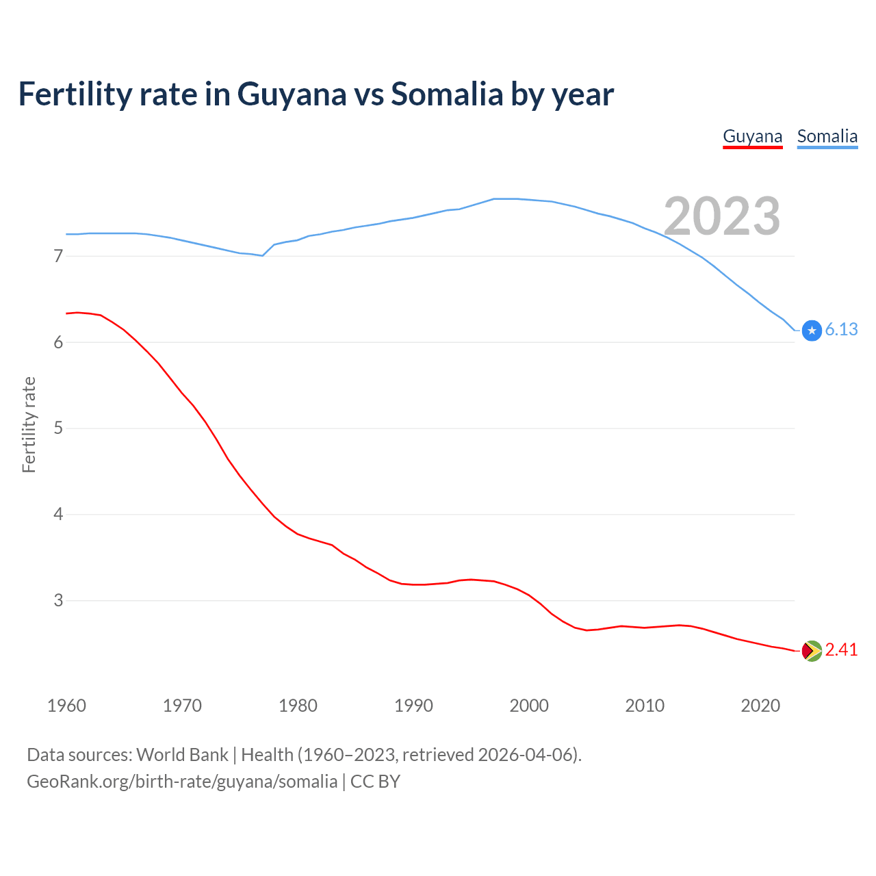 1960 vs 2023, the fertility rate has decreased by 61.9% in Guyana and by 15.4% in Somalia — in 1960, it was 6.33 and 7.25, respectively.
