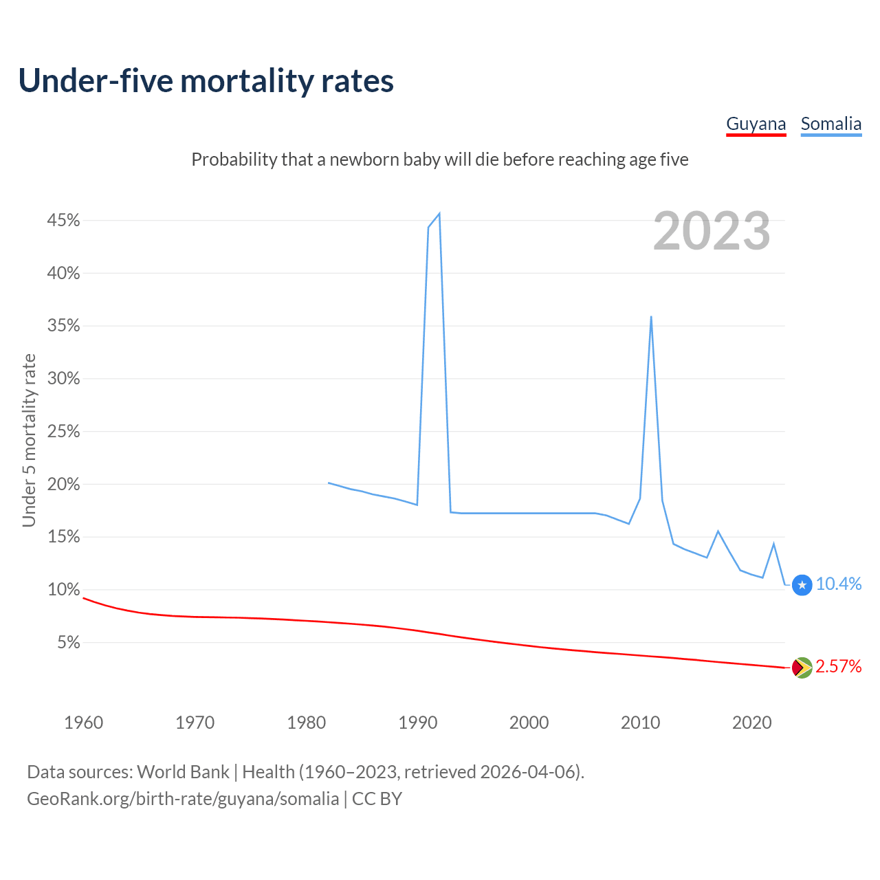 The chance that a newborn baby will die before reaching age five is 2.57% in Guyana and 10.4% in Somalia. Above is a chart with historical data on under-five mortality rates.