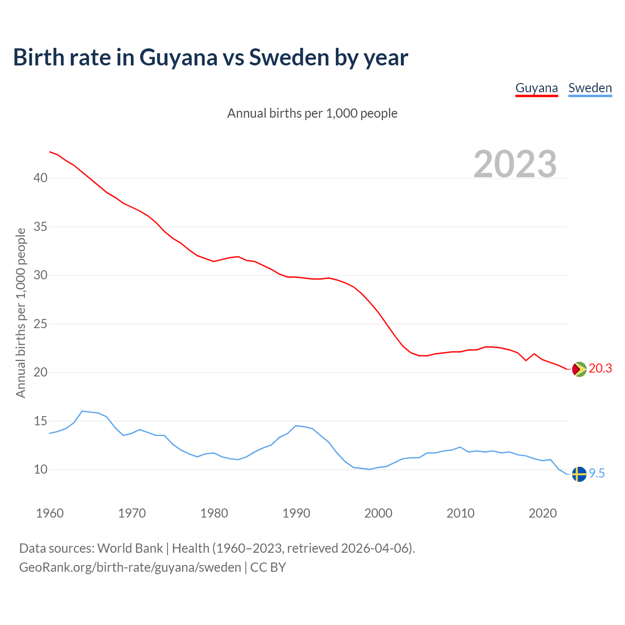 Guyana has an annual birth rate of 20.3 births per 1,000 people, compared to 9.5 for Sweden. The average number of children a woman is expected to have during her lifetime — the fertility rate, is 2.41 in Guyana and 1.45 in Sweden — 39.9% difference.