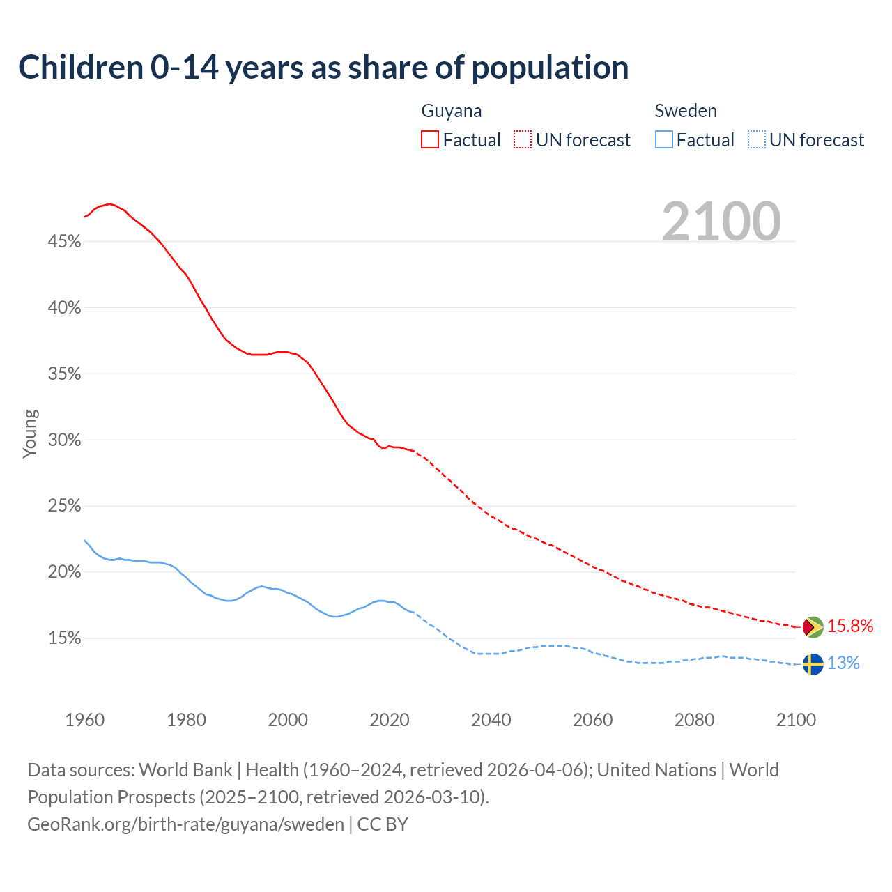 According to the latest available data on birth rates, the fertility rate in Guyana was 2.41 children per woman in 2023, compared to 1.45 in Sweden in 2023. The replacement level is considered to be 2.1 children per woman.