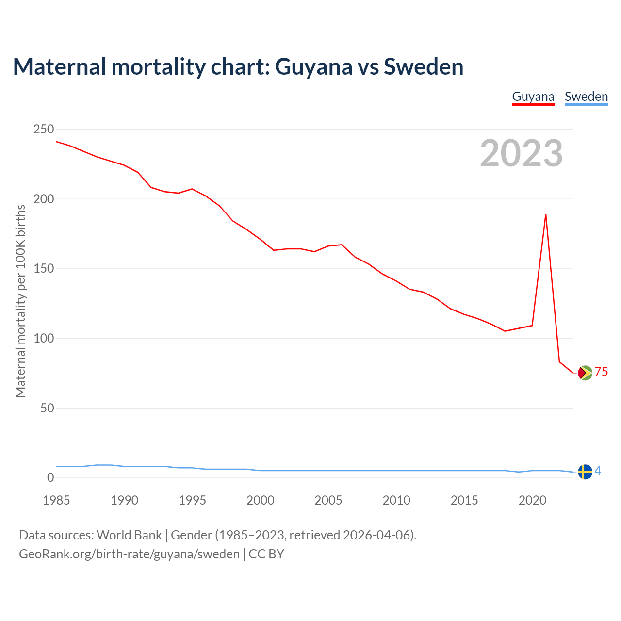 The maternal mortality rate, which is the probability of dying during childbirth or within 42 days of pregnancy termination, is 75 deaths per 100,000 live births in Guyana, compared to 4 deaths in Sweden.