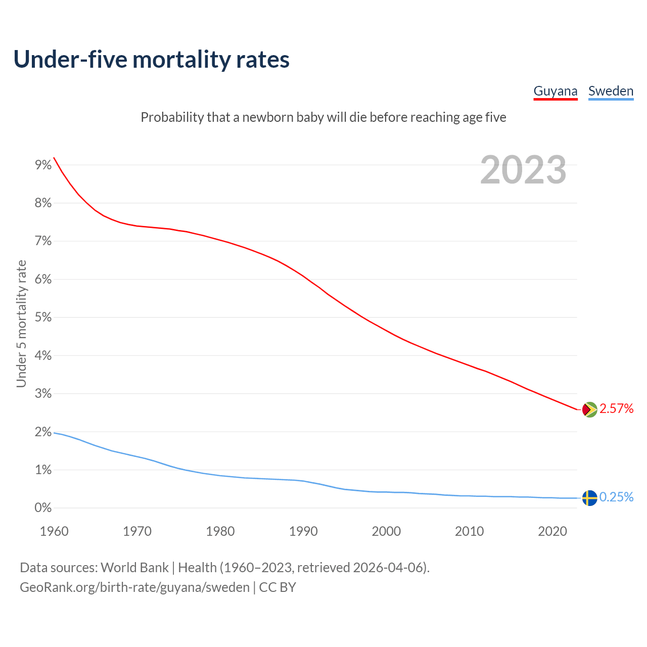 The chance that a newborn baby will die before reaching age five is 2.57% in Guyana and 0.25% in Sweden. Above is a chart with historical data on under-five mortality rates.