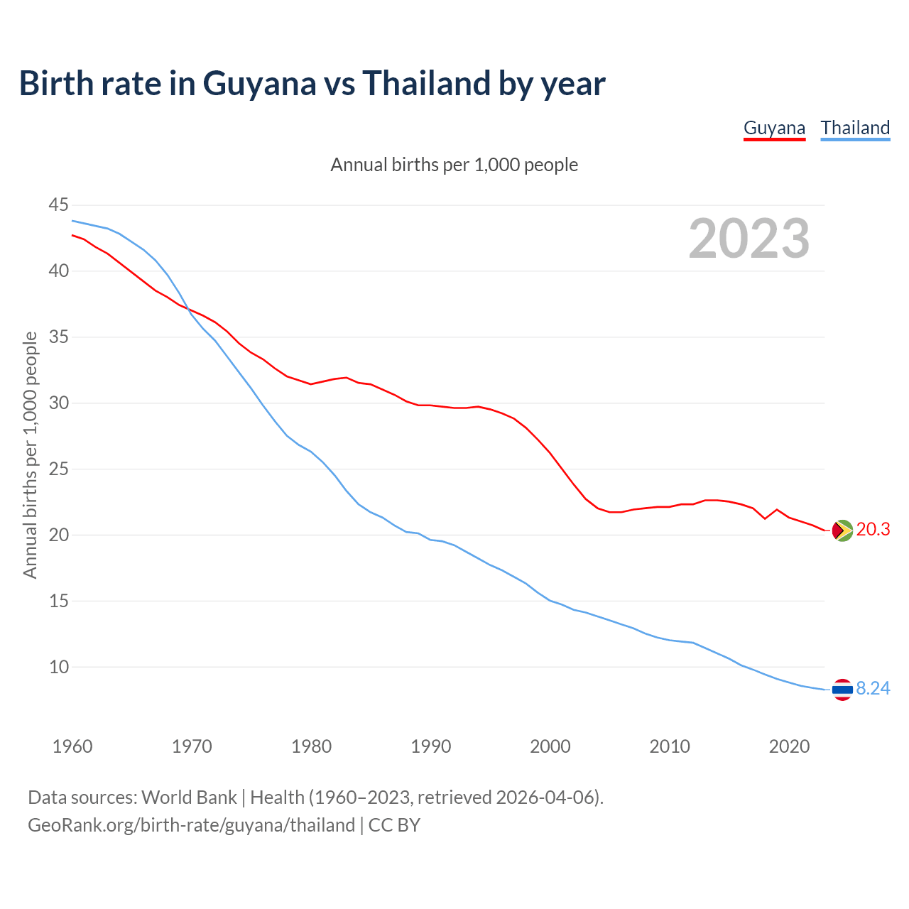 Guyana has an annual birth rate of 20.3 births per 1,000 people, compared to 8.24 for Thailand. The average number of children a woman is expected to have during her lifetime — the fertility rate, is 2.41 in Guyana and 1.21 in Thailand — 49.8% difference.