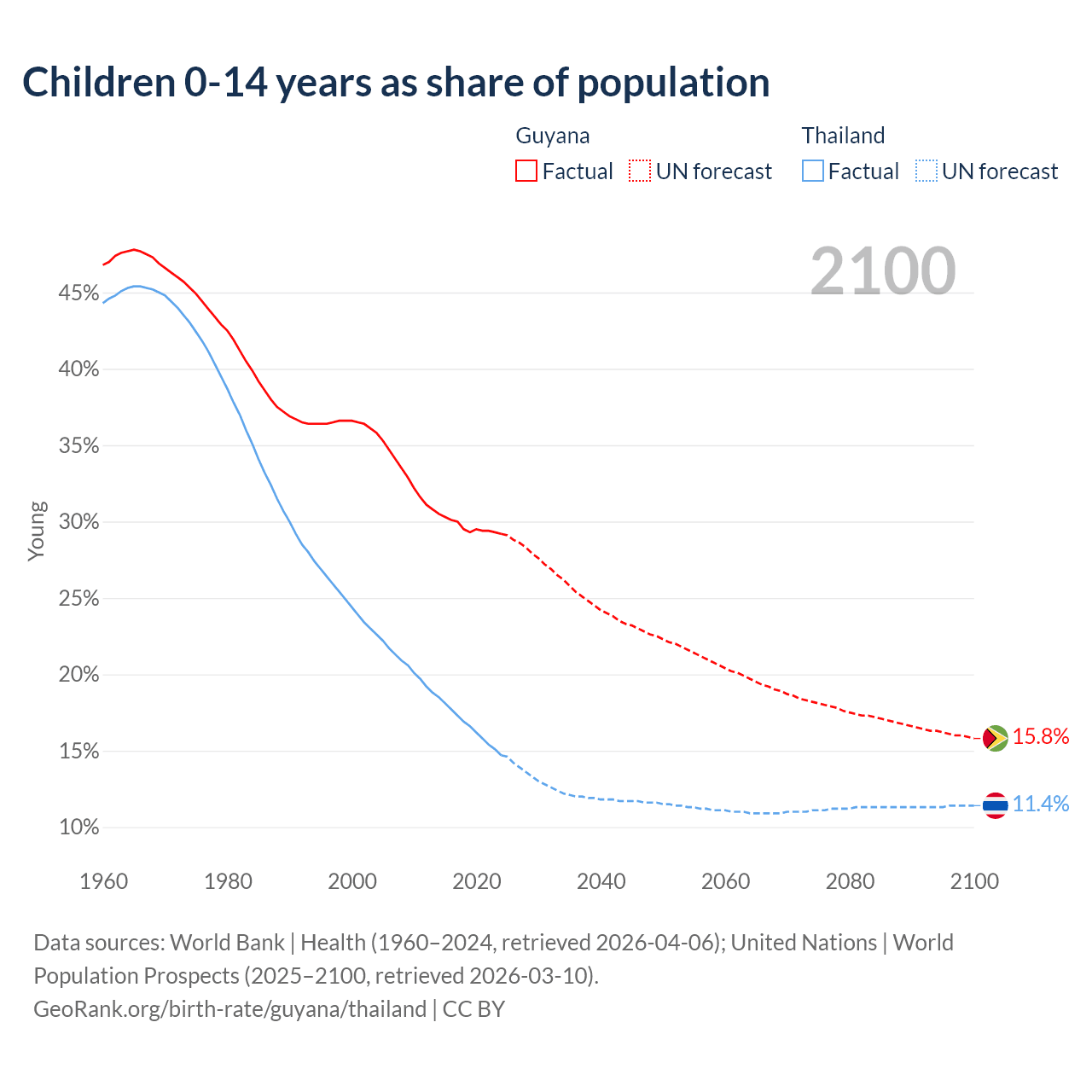 According to the latest available data on birth rates, the fertility rate in Guyana was 2.41 children per woman in 2023, compared to 1.21 in Thailand in 2023. The replacement level is considered to be 2.1 children per woman.