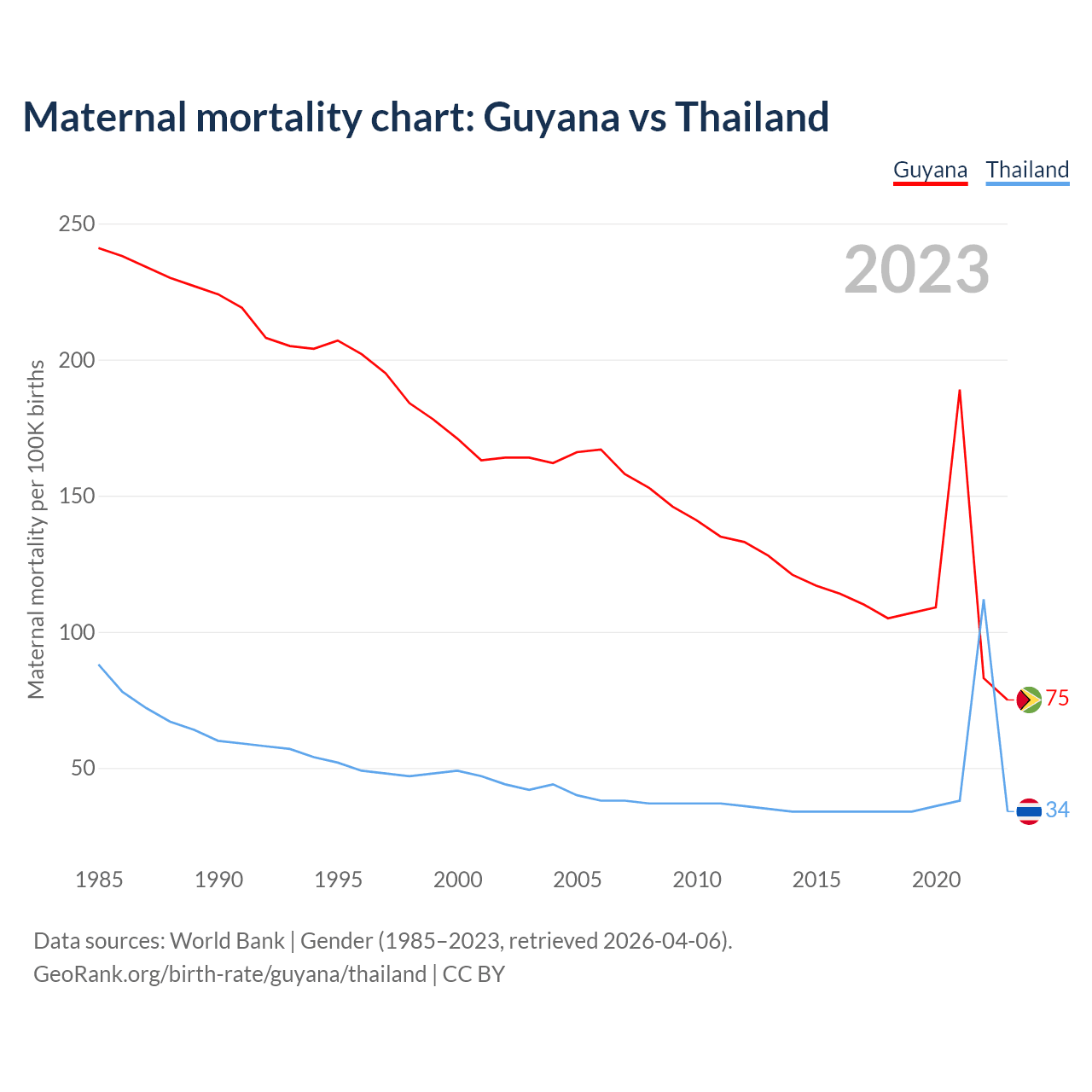 The maternal mortality rate, which is the probability of dying during childbirth or within 42 days of pregnancy termination, is 75 deaths per 100,000 live births in Guyana, compared to 34 deaths in Thailand.