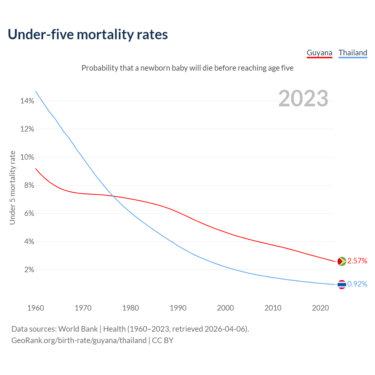 The chance that a newborn baby will die before reaching age five is 2.57% in Guyana and 0.92% in Thailand. Above is a chart with historical data on under-five mortality rates.