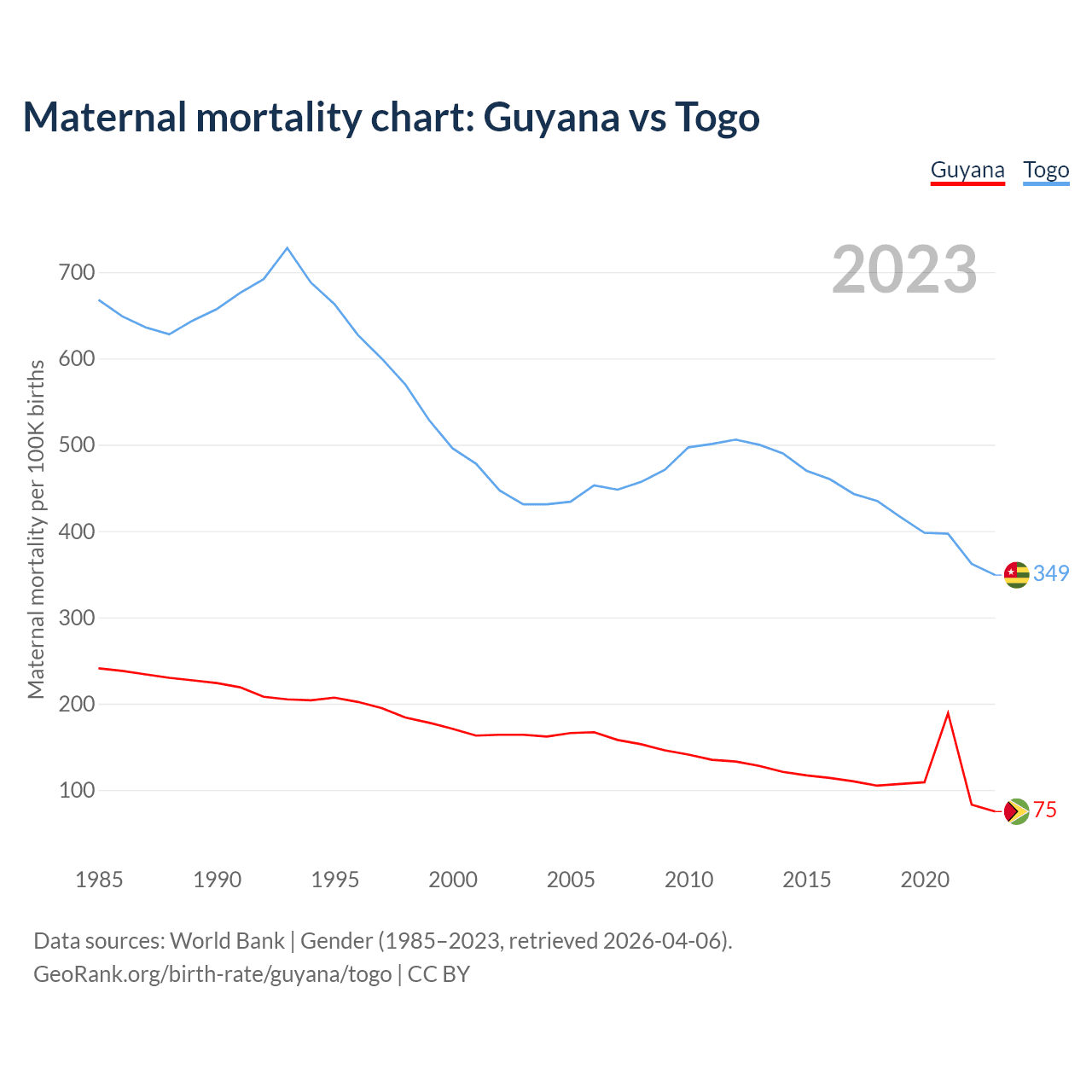 The maternal mortality rate, which is the probability of dying during childbirth or within 42 days of pregnancy termination, is 75 deaths per 100,000 live births in Guyana, compared to 349 deaths in Togo.
