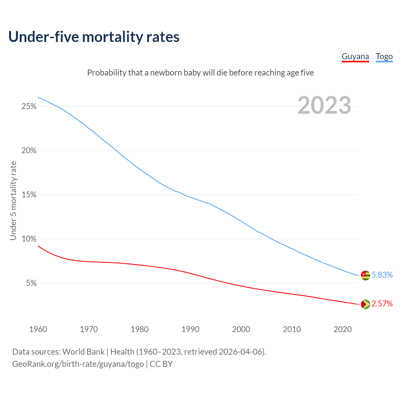 The chance that a newborn baby will die before reaching age five is 2.57% in Guyana and 5.83% in Togo. Above is a chart with historical data on under-five mortality rates.