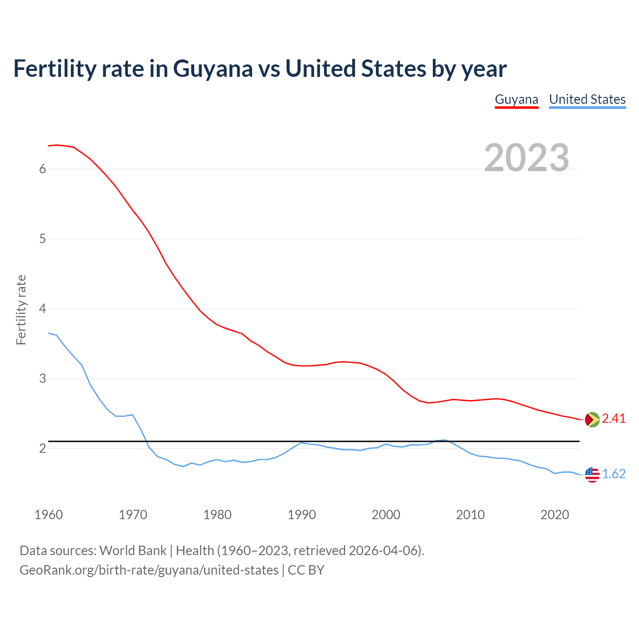 1960 vs 2023, the fertility rate has decreased by 61.9% in Guyana and by 55.8% in the United States — in 1960, it was 6.33 and 3.65, respectively.