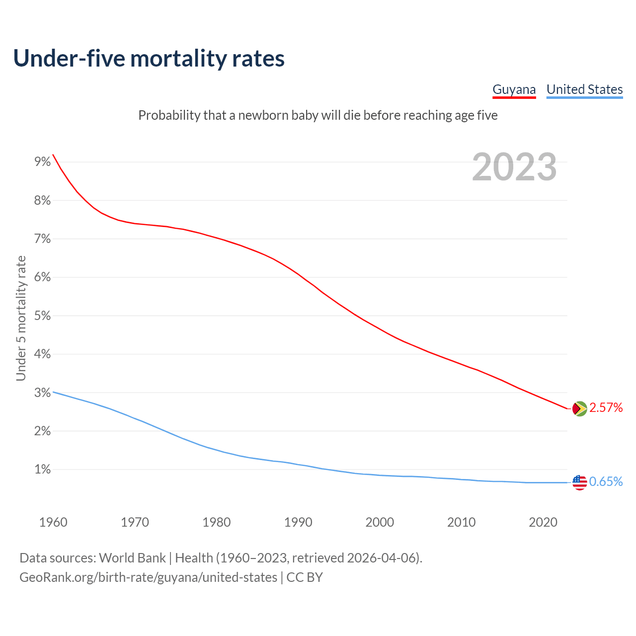 The chance that a newborn baby will die before reaching age five is 2.57% in Guyana and 0.65% in the United States. Above is a chart with historical data on under-five mortality rates.