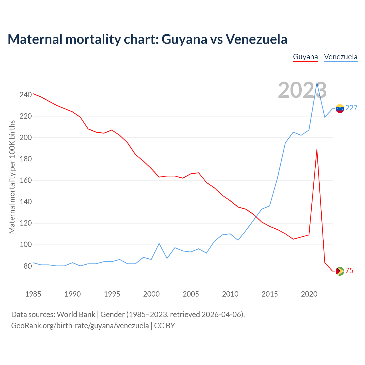 The maternal mortality rate, which is the probability of dying during childbirth or within 42 days of pregnancy termination, is 75 deaths per 100,000 live births in Guyana, compared to 227 deaths in Venezuela.