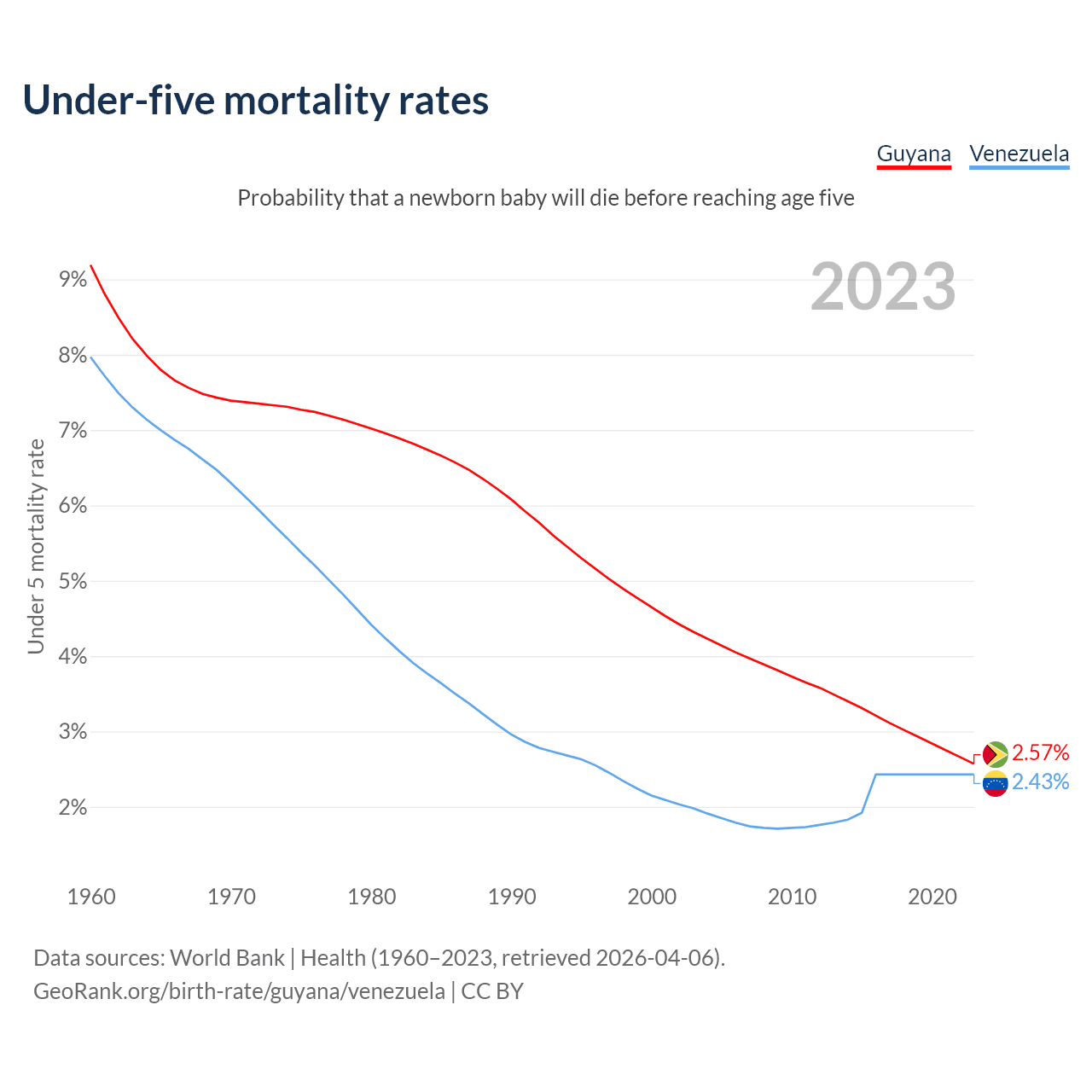 The chance that a newborn baby will die before reaching age five is 2.57% in Guyana and 2.43% in Venezuela. Above is a chart with historical data on under-five mortality rates.