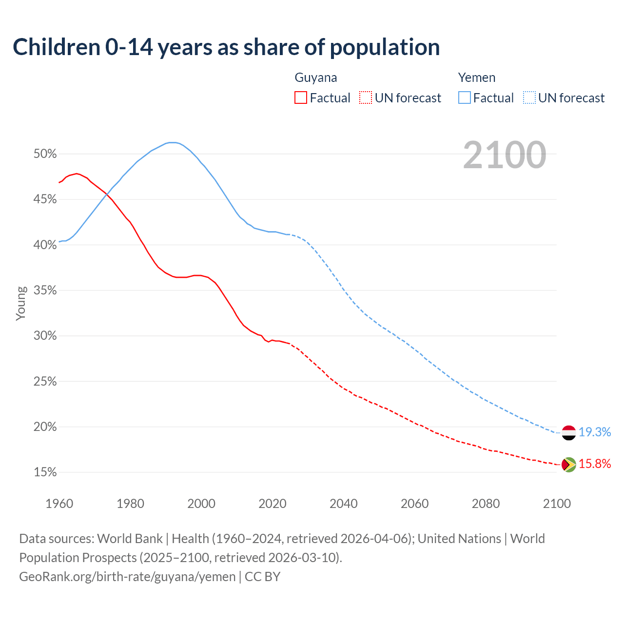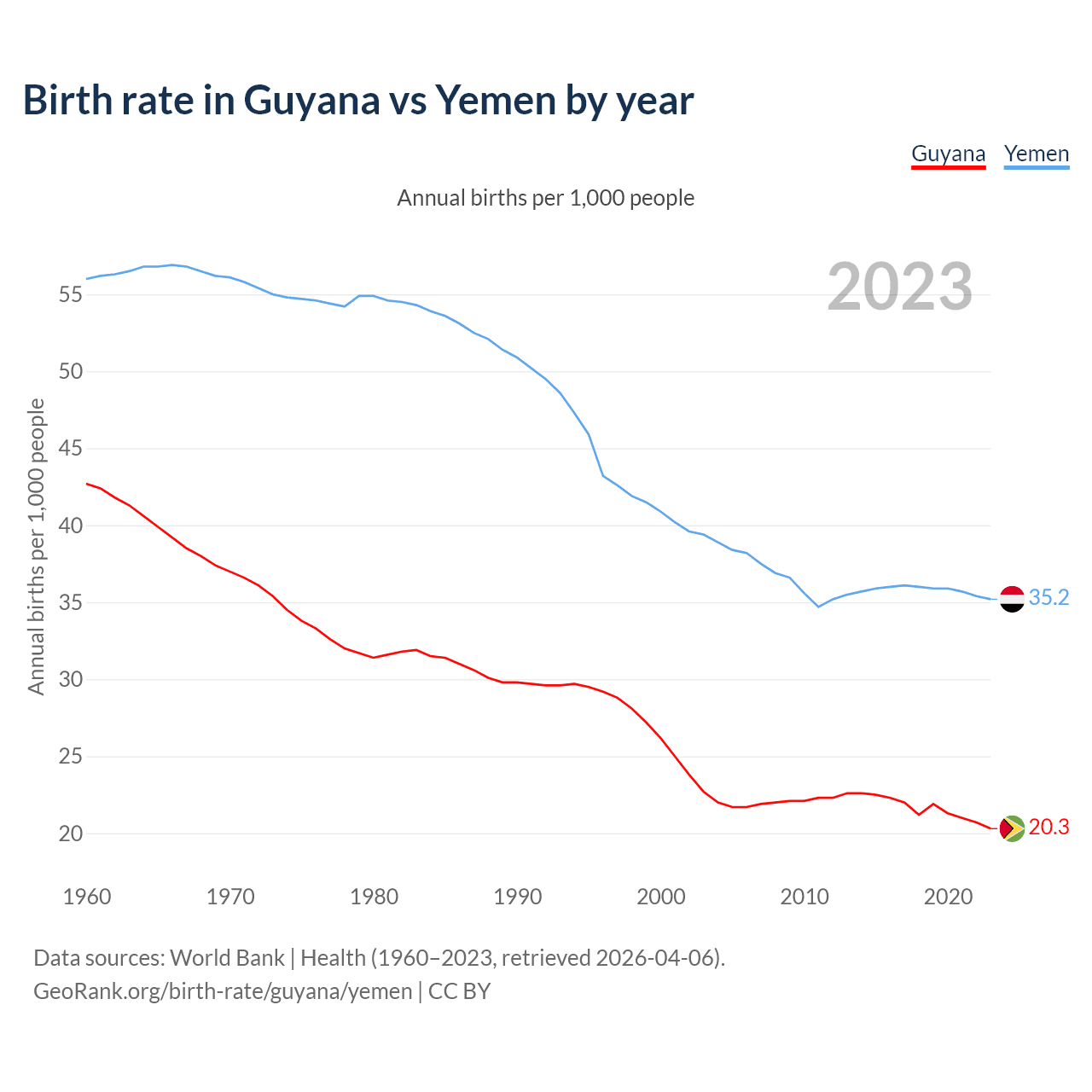Guyana has an annual birth rate of 20.3 births per 1,000 people, compared to 35.2 for Yemen. The average number of children a woman is expected to have during her lifetime — the fertility rate, is 2.41 in Guyana and 4.59 in Yemen — 90.3% difference.