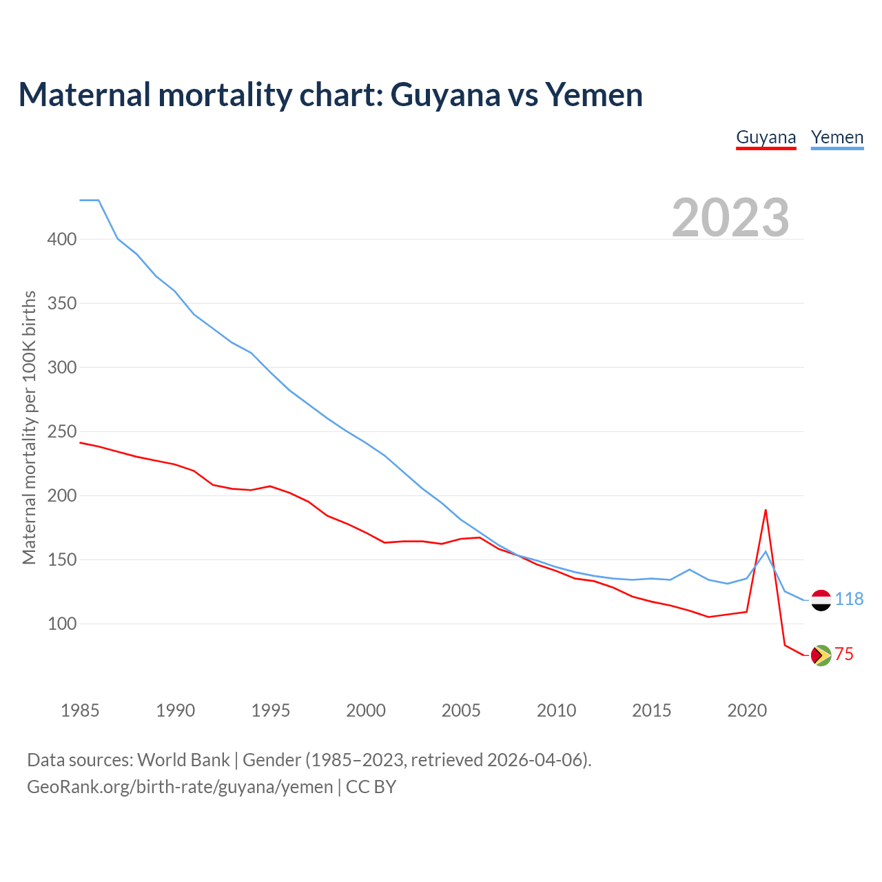 The maternal mortality rate, which is the probability of dying during childbirth or within 42 days of pregnancy termination, is 75 deaths per 100,000 live births in Guyana, compared to 118 deaths in Yemen.