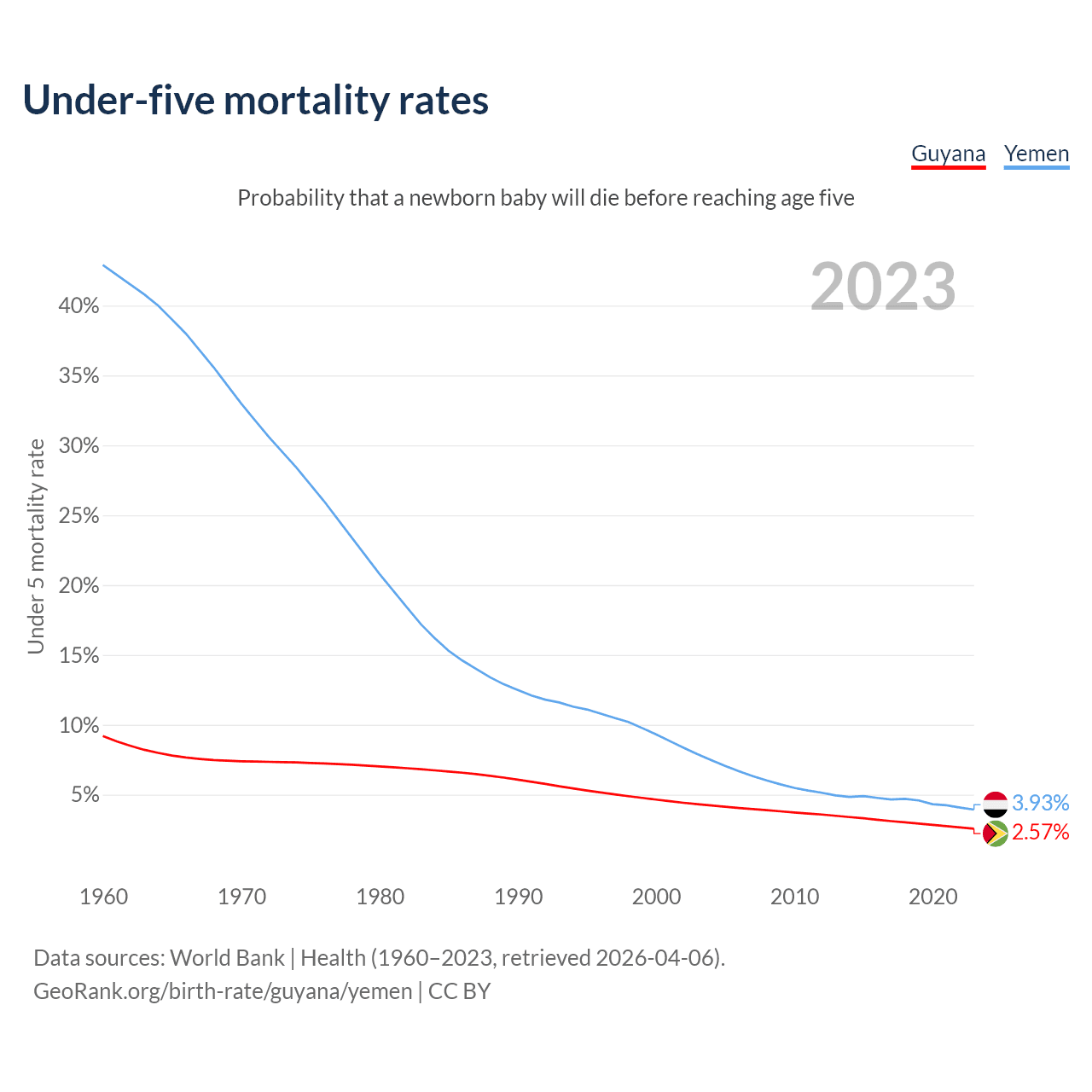 The chance that a newborn baby will die before reaching age five is 2.57% in Guyana and 3.93% in Yemen. Above is a chart with historical data on under-five mortality rates.