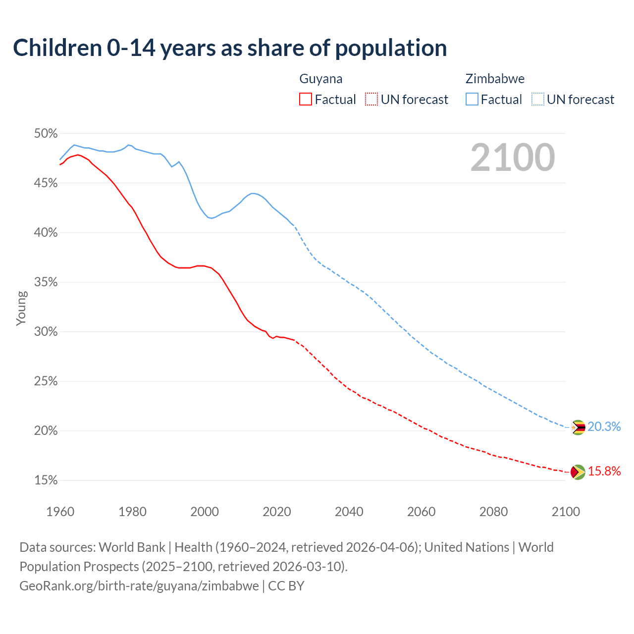 According to the latest available data on birth rates, the fertility rate in Guyana was 2.41 children per woman in 2023, compared to 3.72 in Zimbabwe in 2023. The replacement level is considered to be 2.1 children per woman.