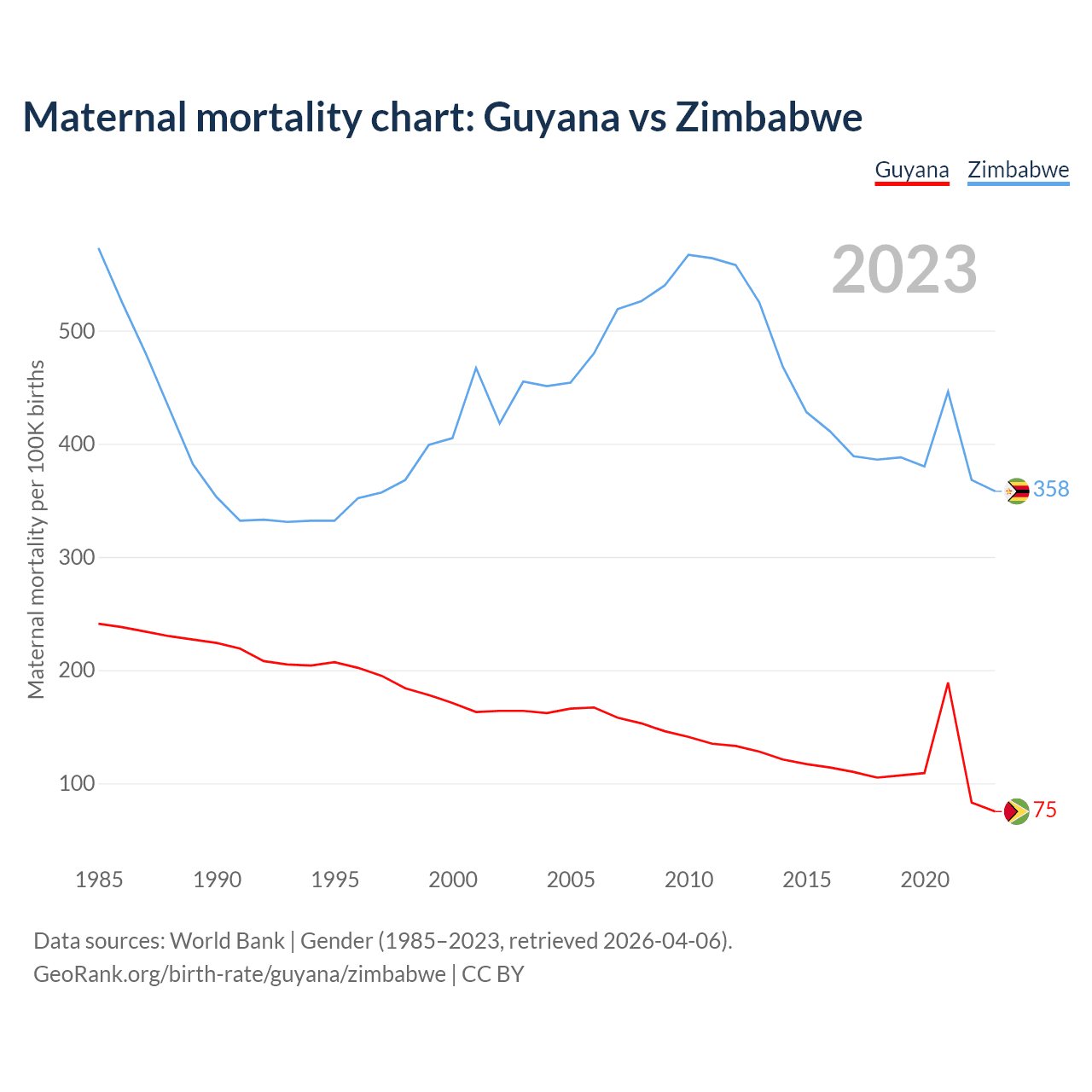 The maternal mortality rate, which is the probability of dying during childbirth or within 42 days of pregnancy termination, is 75 deaths per 100,000 live births in Guyana, compared to 358 deaths in Zimbabwe.