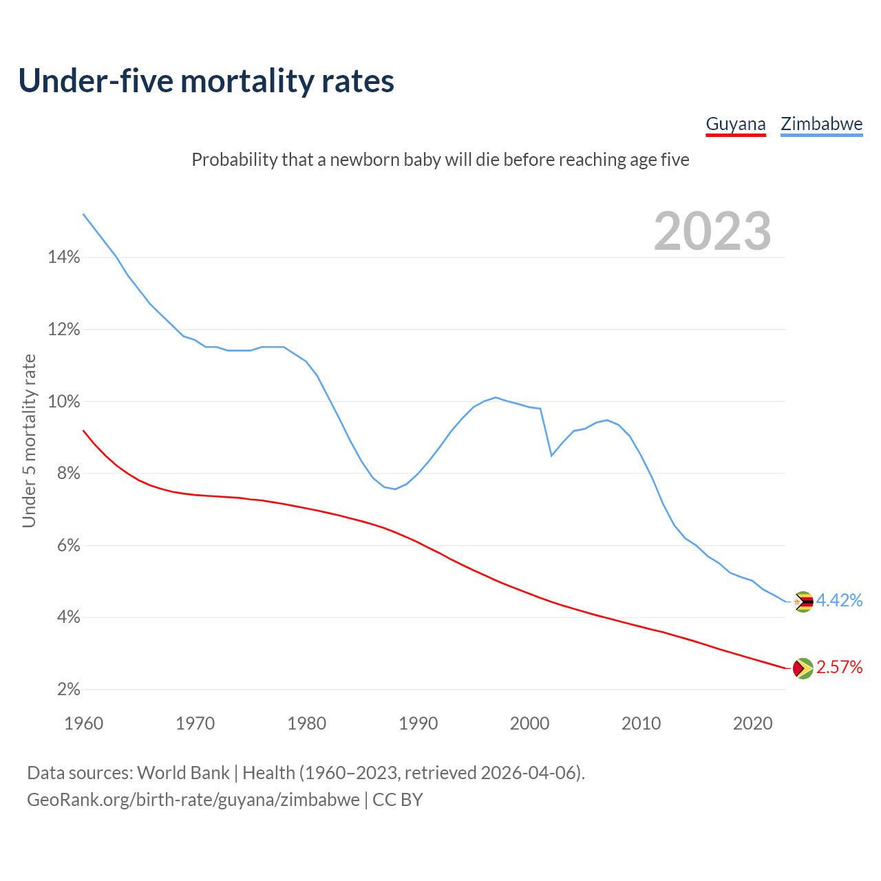 The chance that a newborn baby will die before reaching age five is 2.57% in Guyana and 4.42% in Zimbabwe. Above is a chart with historical data on under-five mortality rates.