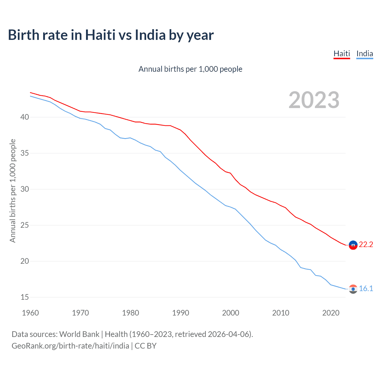 Haiti has an annual birth rate of 22.2 births per 1,000 people, compared to 16.1 for India. The average number of children a woman is expected to have during her lifetime — the fertility rate, is 2.66 in Haiti and 1.98 in India — 25.6% difference.