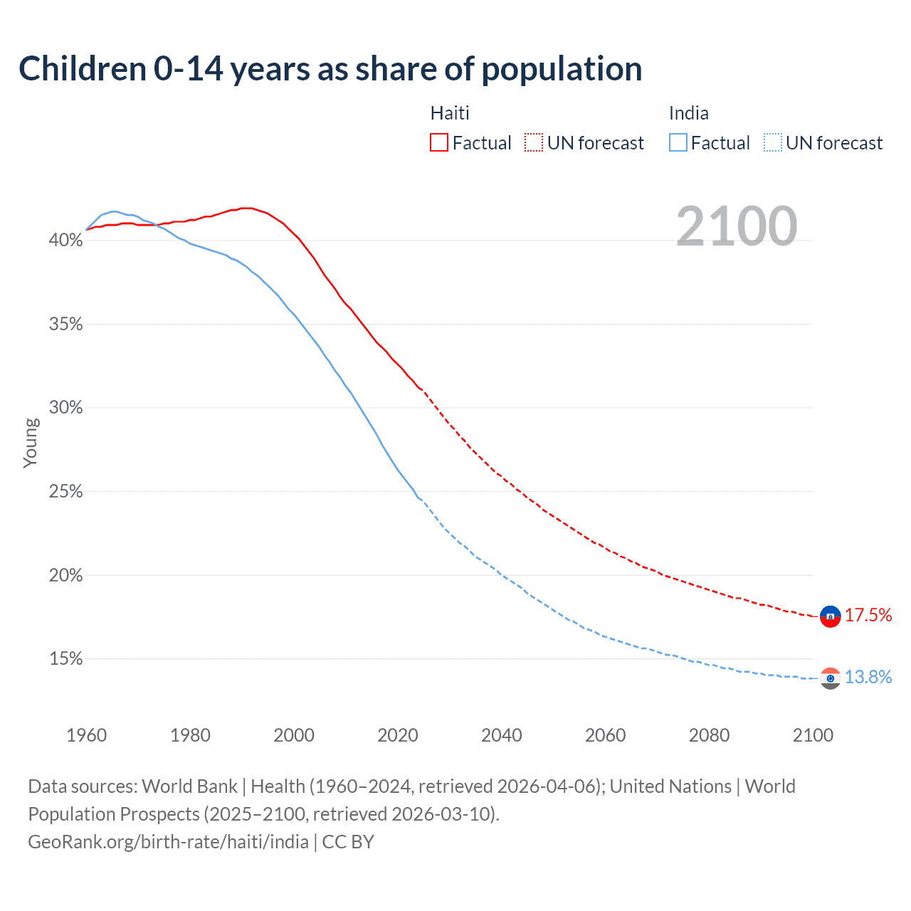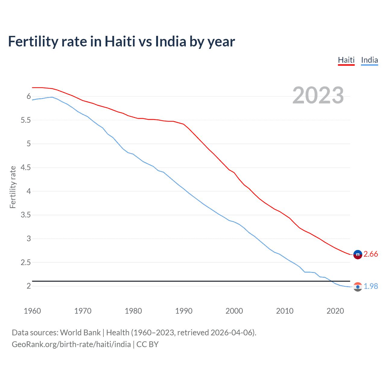 According to the latest available data on birth rates, the fertility rate in Haiti was 2.66 children per woman in 2023, compared to 1.98 in India in 2023. The replacement level is considered to be 2.1 children per woman.