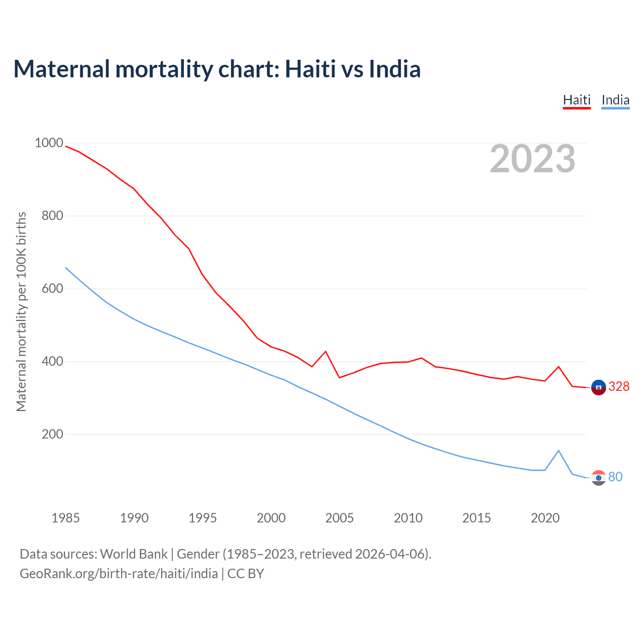 The maternal mortality rate, which is the probability of dying during childbirth or within 42 days of pregnancy termination, is 328 deaths per 100,000 live births in Haiti, compared to 80 deaths in India.