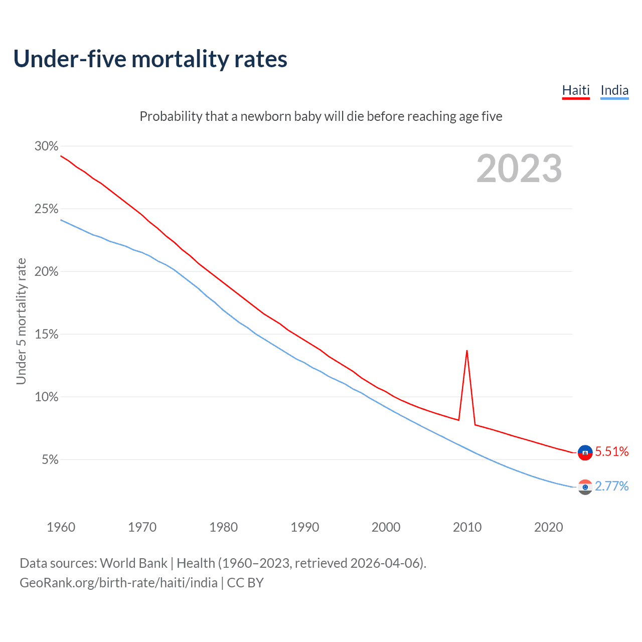 The chance that a newborn baby will die before reaching age five is 5.51% in Haiti and 2.77% in India. Above is a chart with historical data on under-five mortality rates.