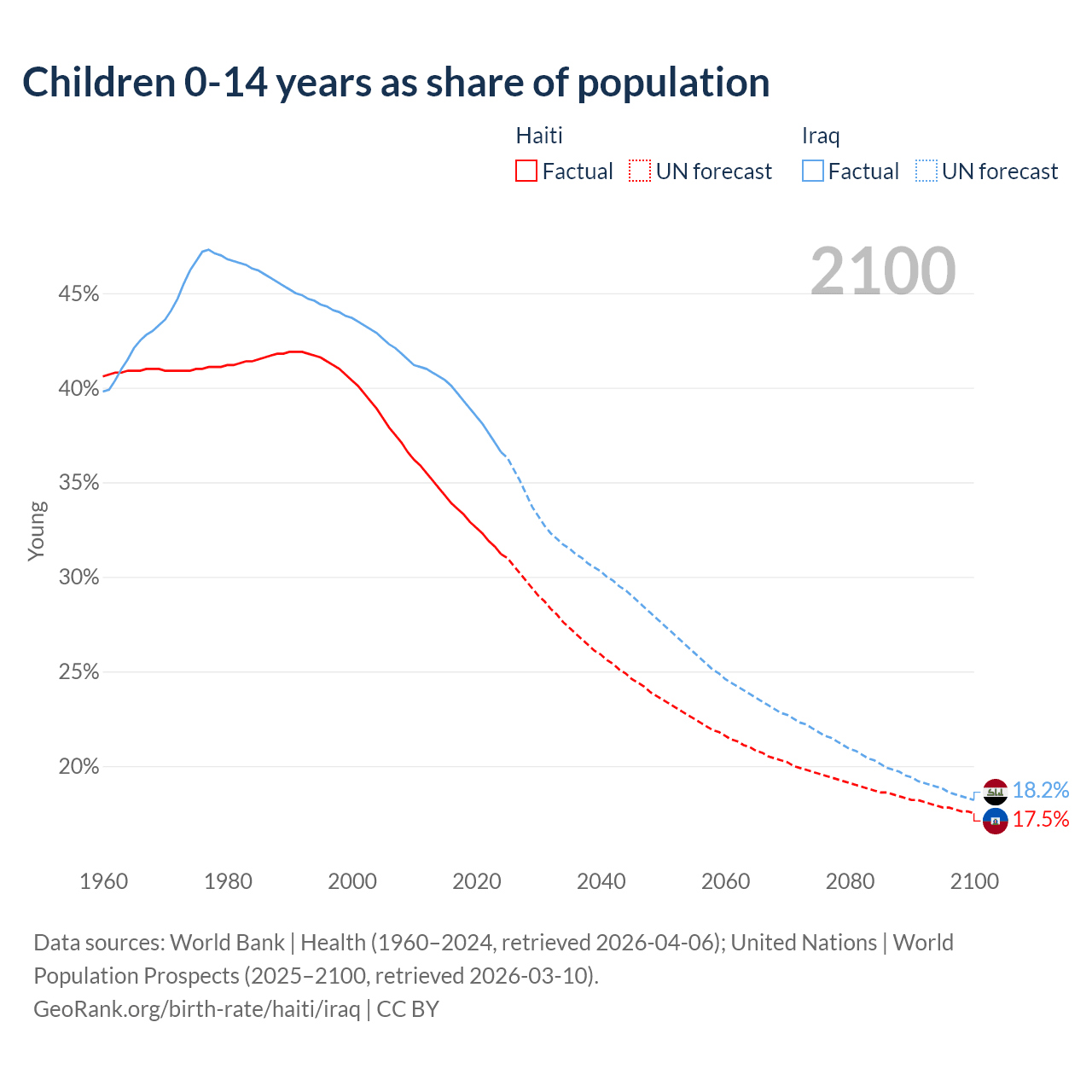 According to the latest available data on birth rates, the fertility rate in Haiti was 2.66 children per woman in 2023, compared to 3.25 in Iraq in 2023. The replacement level is considered to be 2.1 children per woman.