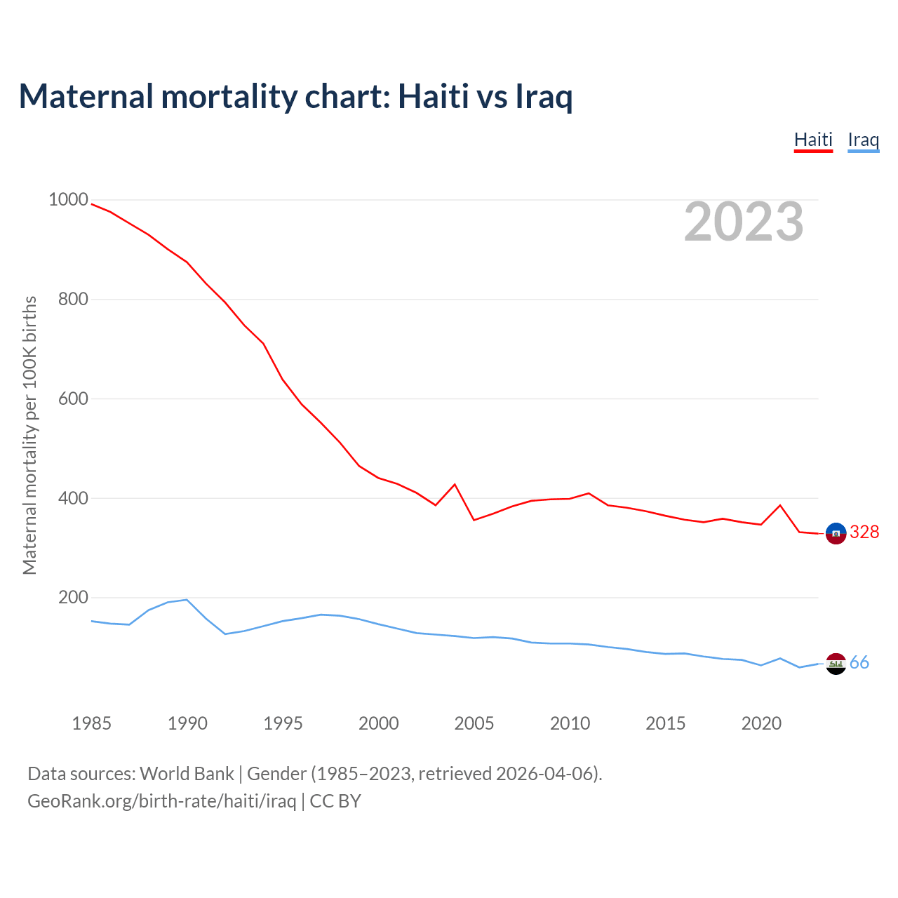 The maternal mortality rate, which is the probability of dying during childbirth or within 42 days of pregnancy termination, is 328 deaths per 100,000 live births in Haiti, compared to 66 deaths in Iraq.