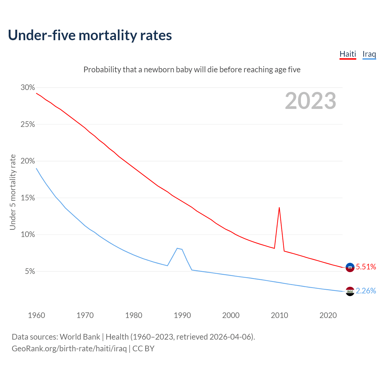 The chance that a newborn baby will die before reaching age five is 5.51% in Haiti and 2.26% in Iraq. Above is a chart with historical data on under-five mortality rates.