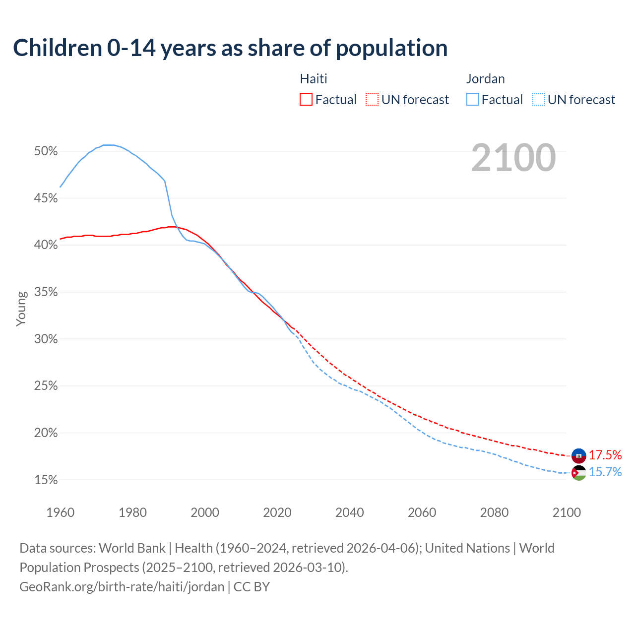 According to the latest available data on birth rates, the fertility rate in Haiti was 2.66 children per woman in 2023, compared to 2.64 in Jordan in 2023. The replacement level is considered to be 2.1 children per woman.