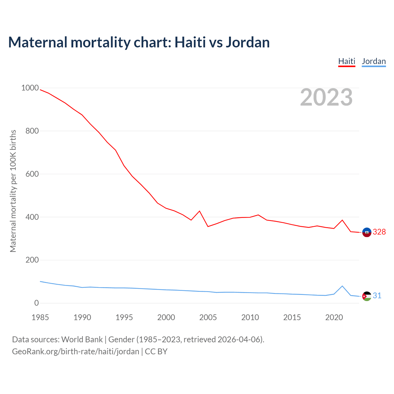 The maternal mortality rate, which is the probability of dying during childbirth or within 42 days of pregnancy termination, is 328 deaths per 100,000 live births in Haiti, compared to 31 deaths in Jordan.