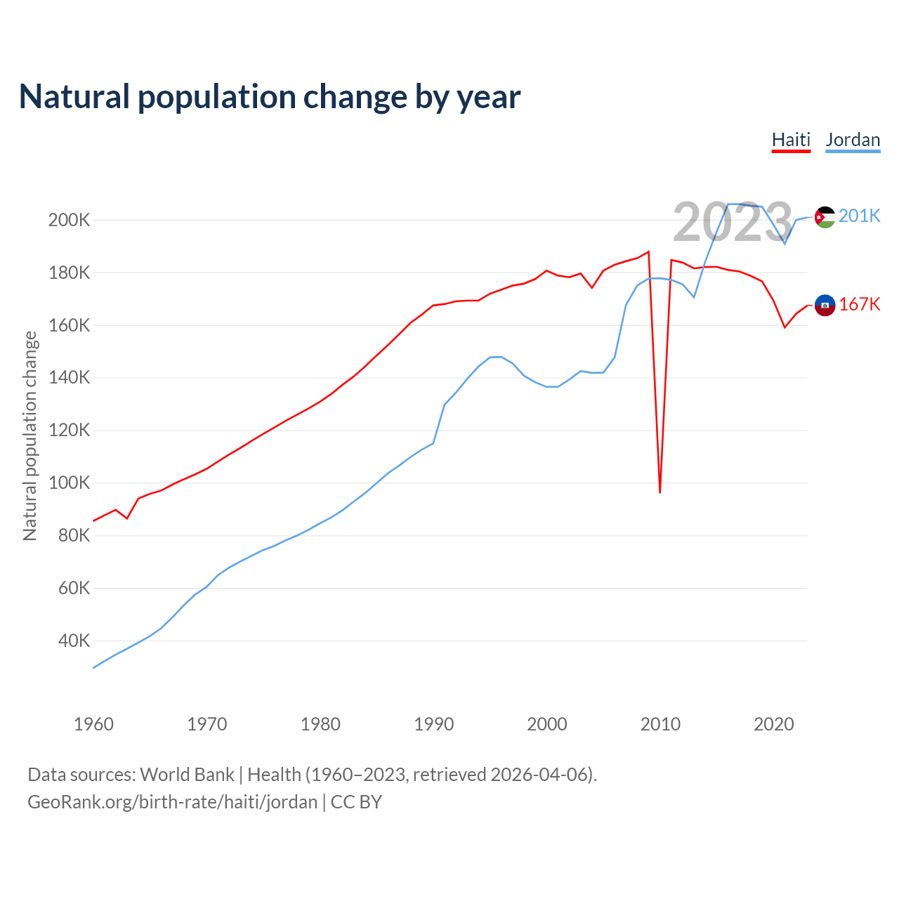 Haiti has an annual birth rate of 22.2 births per 1,000 people, compared to 20.6 for Jordan. The average number of children a woman is expected to have during her lifetime — the fertility rate, is 2.66 in Haiti and 2.64 in Jordan — 0.64% difference.