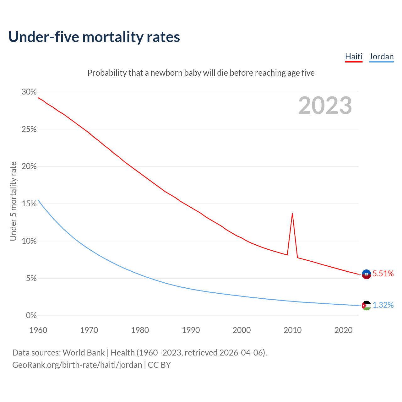 The chance that a newborn baby will die before reaching age five is 5.51% in Haiti and 1.32% in Jordan. Above is a chart with historical data on under-five mortality rates.