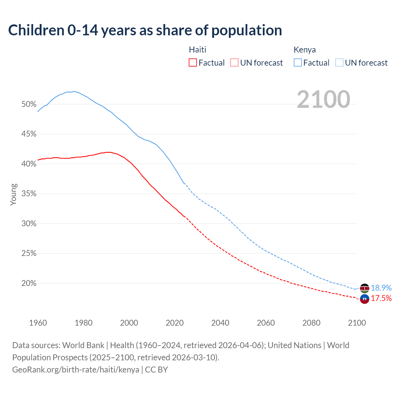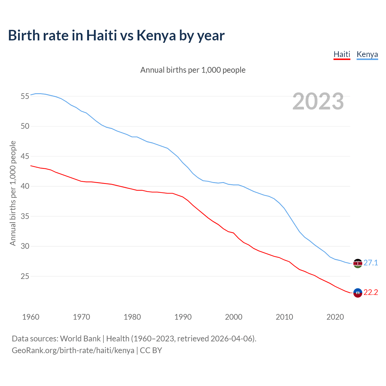According to the latest available data on birth rates, the fertility rate in Haiti was 2.66 children per woman in 2023, compared to 3.21 in Kenya in 2023. The replacement level is considered to be 2.1 children per woman.
