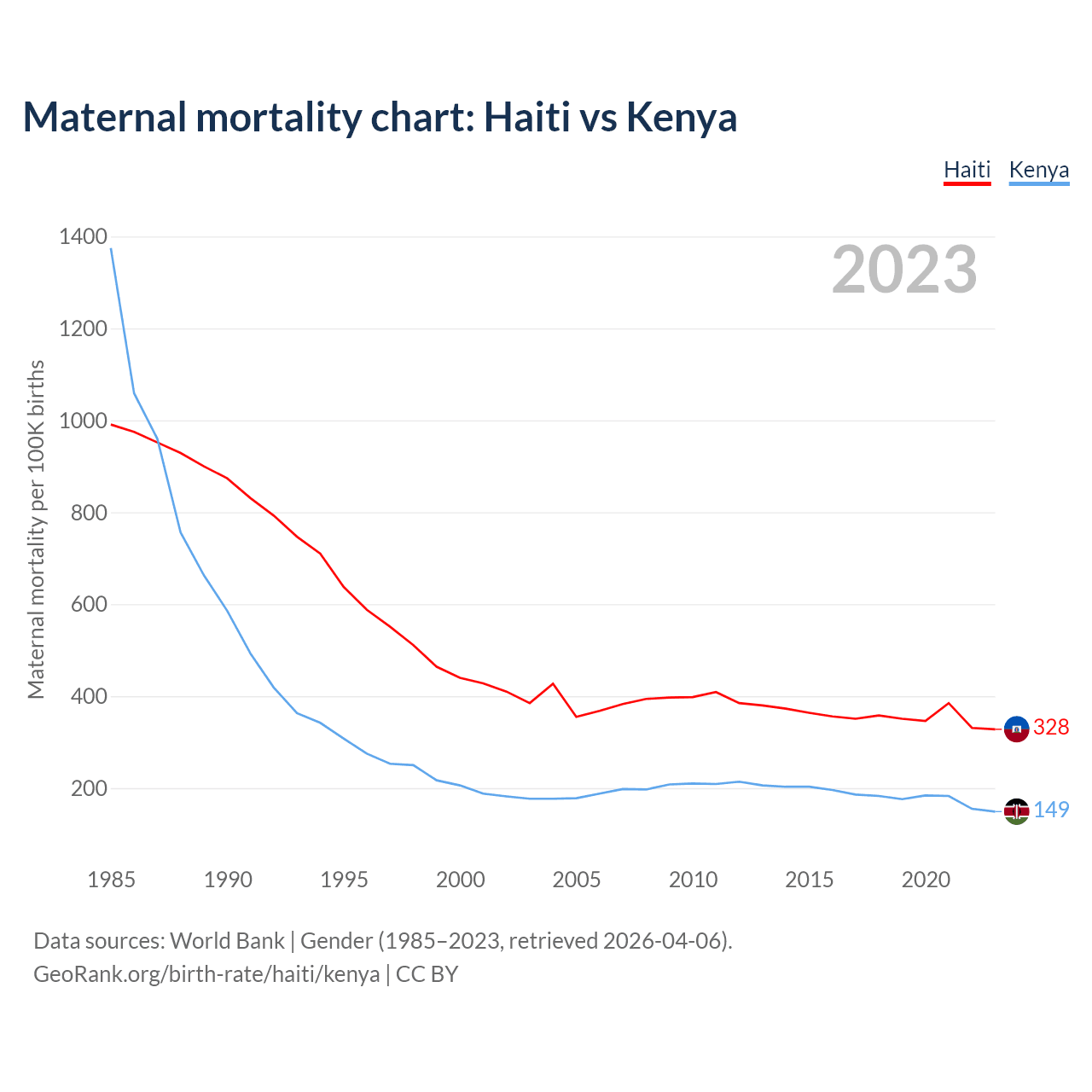 The maternal mortality rate, which is the probability of dying during childbirth or within 42 days of pregnancy termination, is 328 deaths per 100,000 live births in Haiti, compared to 149 deaths in Kenya.