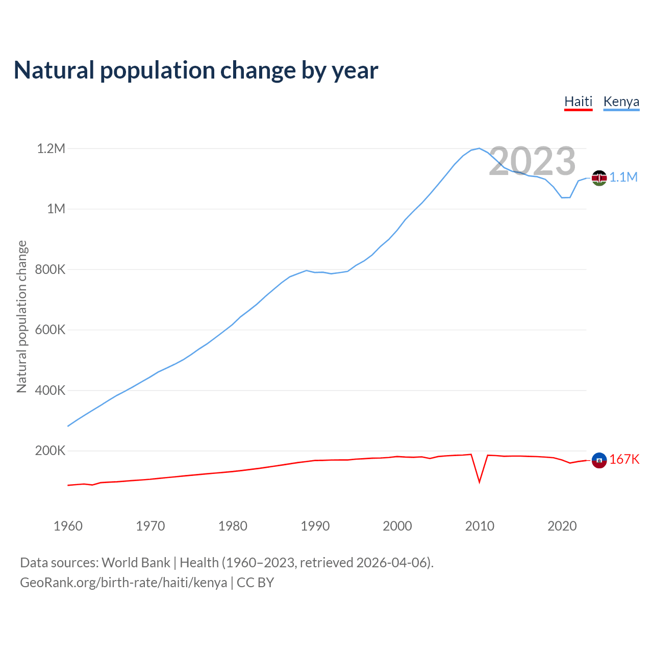 Haiti has an annual birth rate of 22.2 births per 1,000 people, compared to 27.1 for Kenya. The average number of children a woman is expected to have during her lifetime — the fertility rate, is 2.66 in Haiti and 3.21 in Kenya — 20.8% difference.