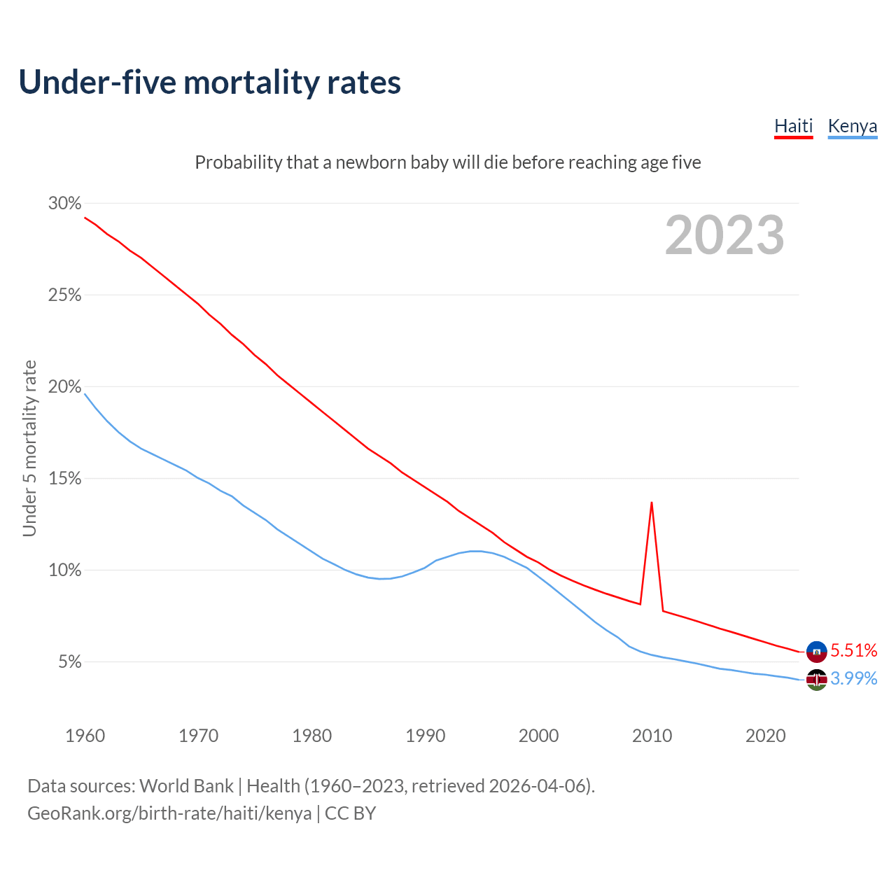 The chance that a newborn baby will die before reaching age five is 5.51% in Haiti and 3.99% in Kenya. Above is a chart with historical data on under-five mortality rates.