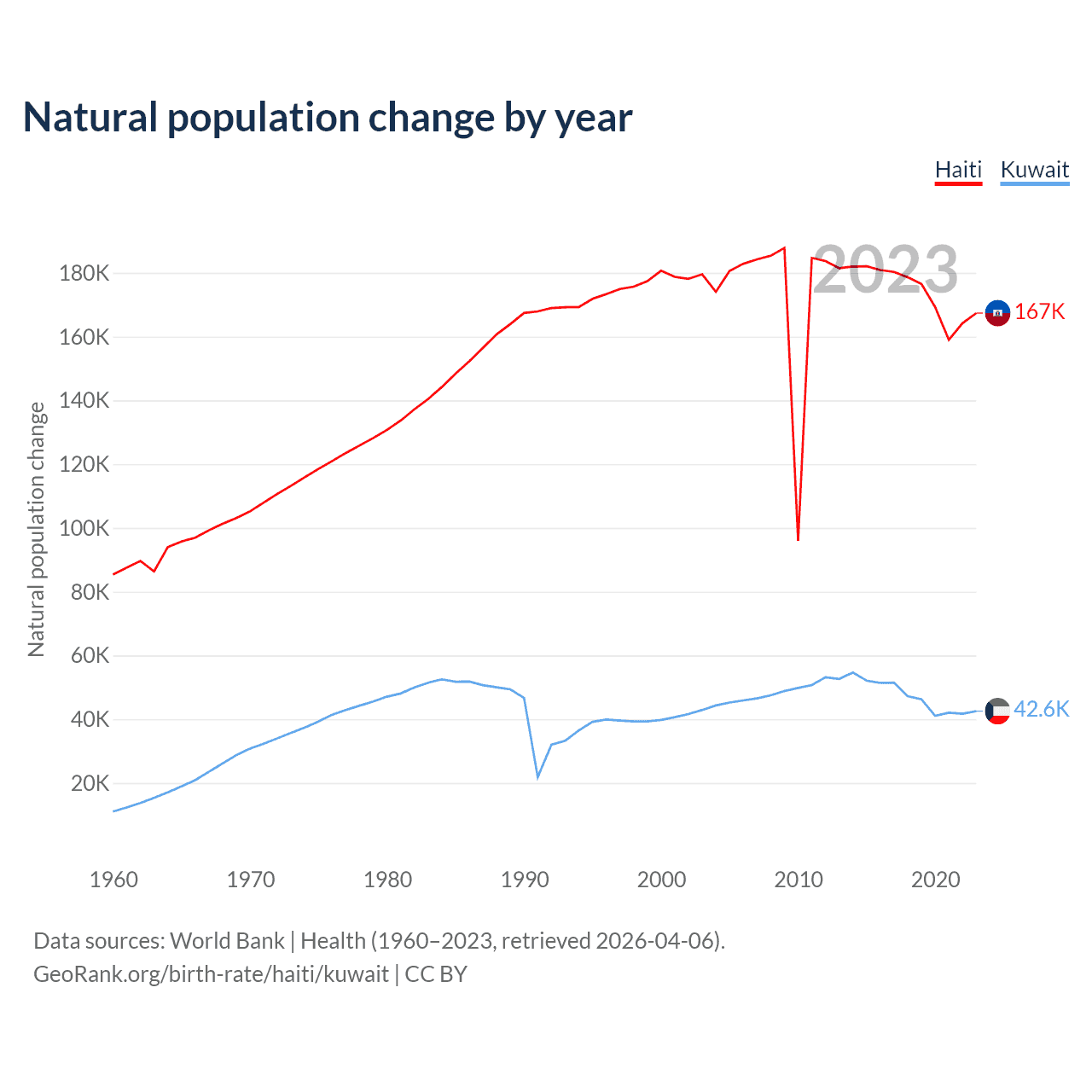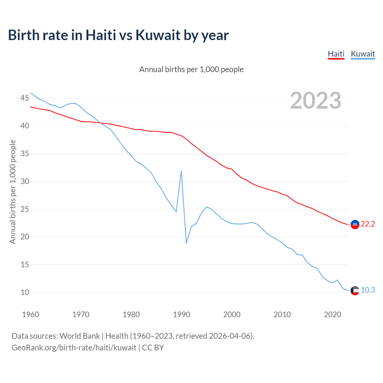 Haiti has an annual birth rate of 22.2 births per 1,000 people, compared to 10.3 for Kuwait. The average number of children a woman is expected to have during her lifetime — the fertility rate, is 2.66 in Haiti and 1.52 in Kuwait — 42.6% difference.