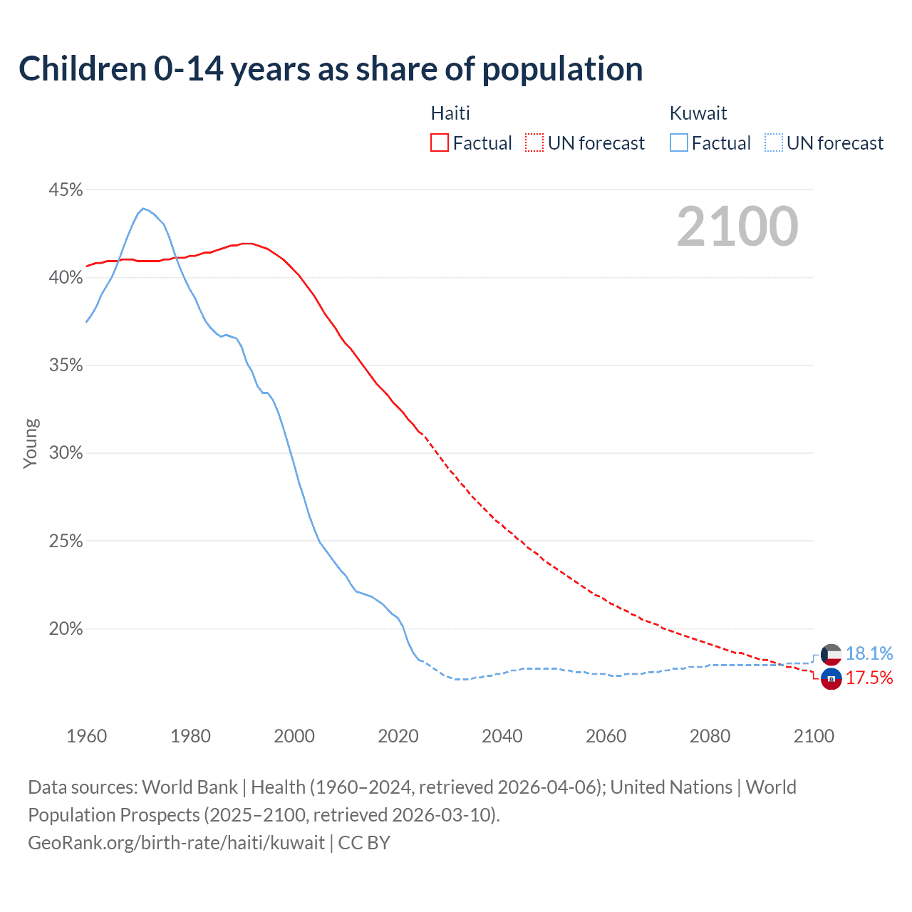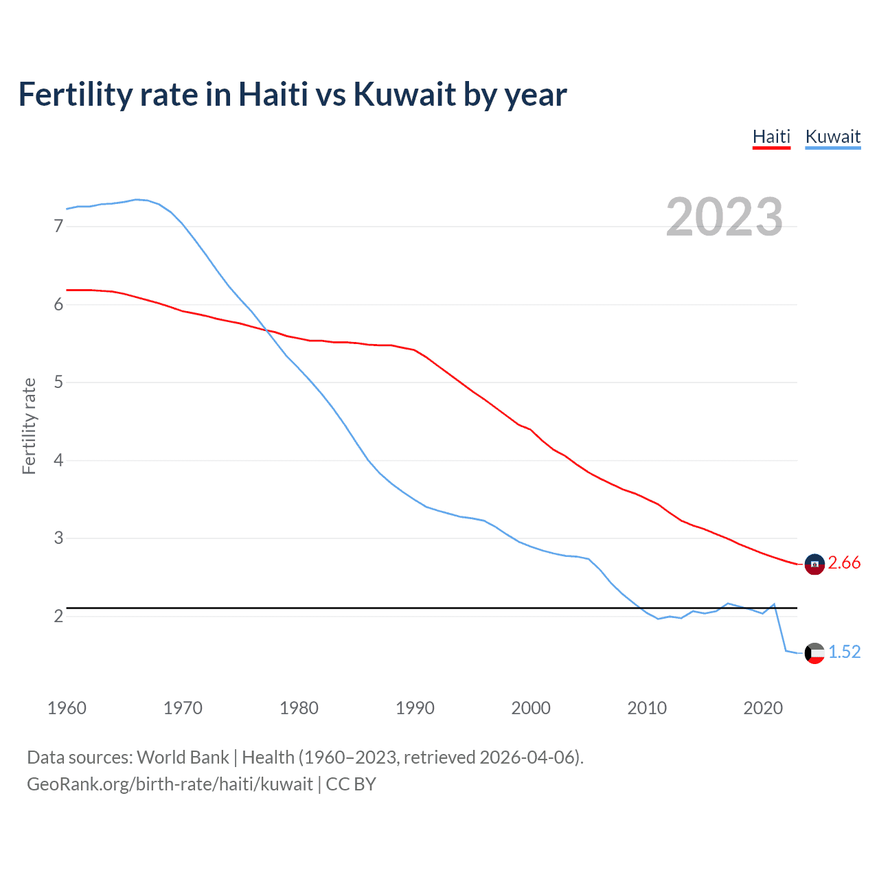 According to the latest available data on birth rates, the fertility rate in Haiti was 2.66 children per woman in 2023, compared to 1.52 in Kuwait in 2023. The replacement level is considered to be 2.1 children per woman.